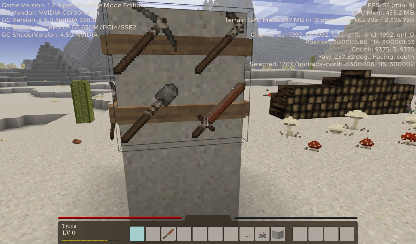 - Added client side mesher api to allow for injection of custom meshdata into the terrain tesselator (used by the ingot piles and tool racks).
