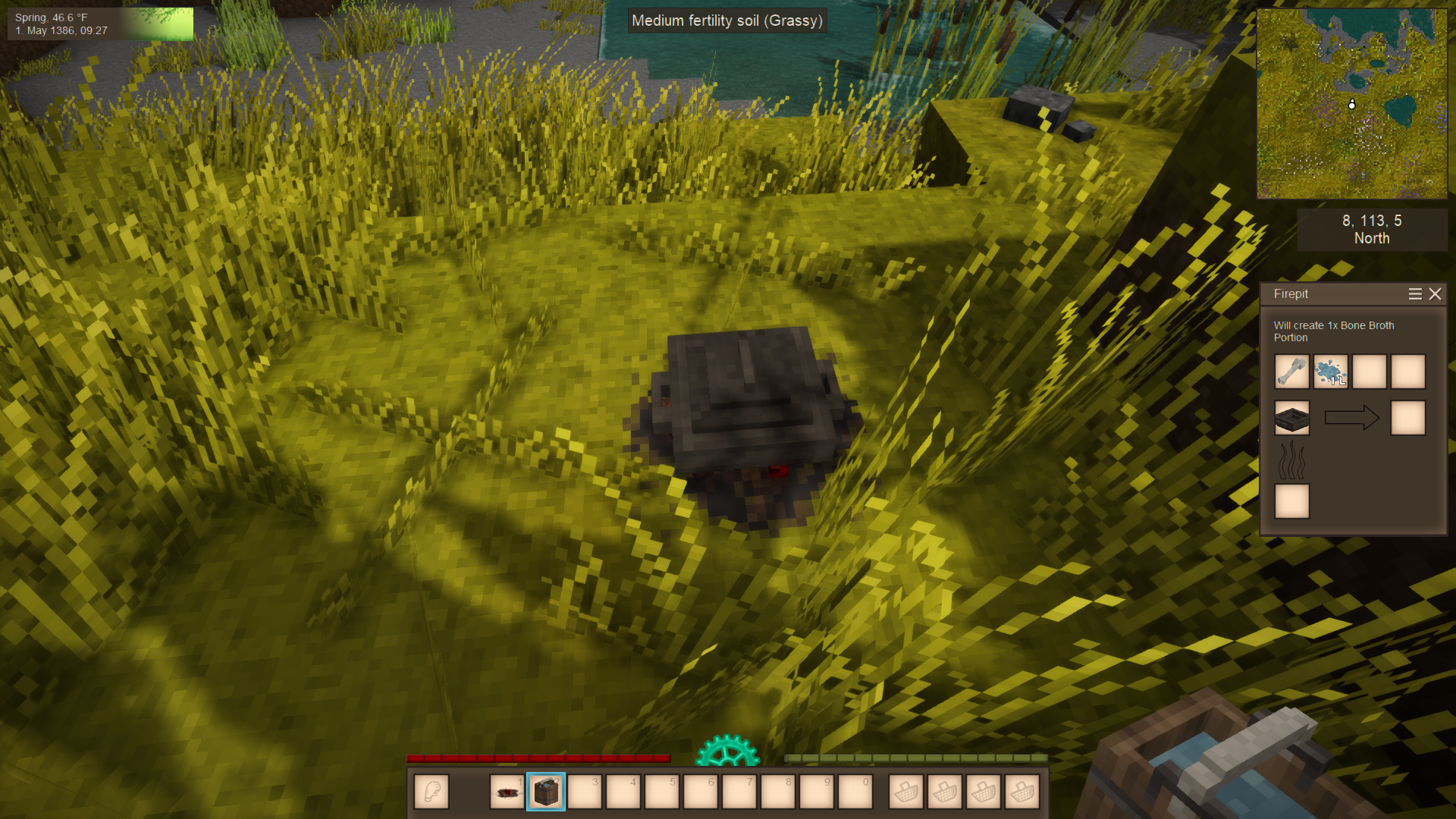 NOTE: In order to actually boil something,  you need to place the saucepan on a firepit and then you place items into its slots. It will NOT just boil liquids that are stored in it as if it were a bucket. This is called a "simmer" recipe within the game's files.