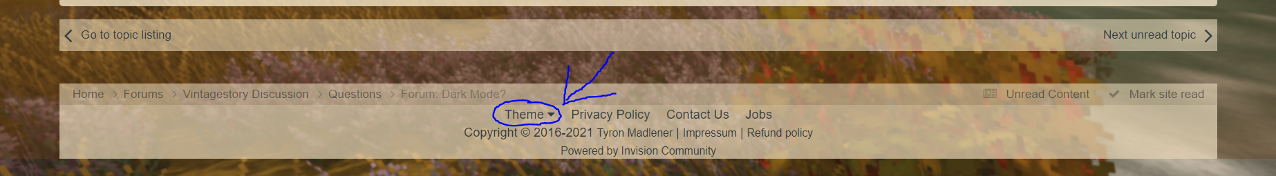 Solution Giciel Posted May 28, 2023 Solution Report Posted May 28, 2023 (edited) There's no dark mode that I'm aware of. But I know there's 2 different themes on this site : The "Vintage Story (default)" with light brown beige color and green for the buttons The "Classic High Contrast" which is pure white. Normaly you should be on the first one by default but it doesn't hurt to check. The option for the Theme is at the bottom of the page next to "Privacy Policy". If you are already on the default theme then I suggest you to lower the luminosity levels of your screen if it hurts that much. Edited May 28, 2023 by Giciel