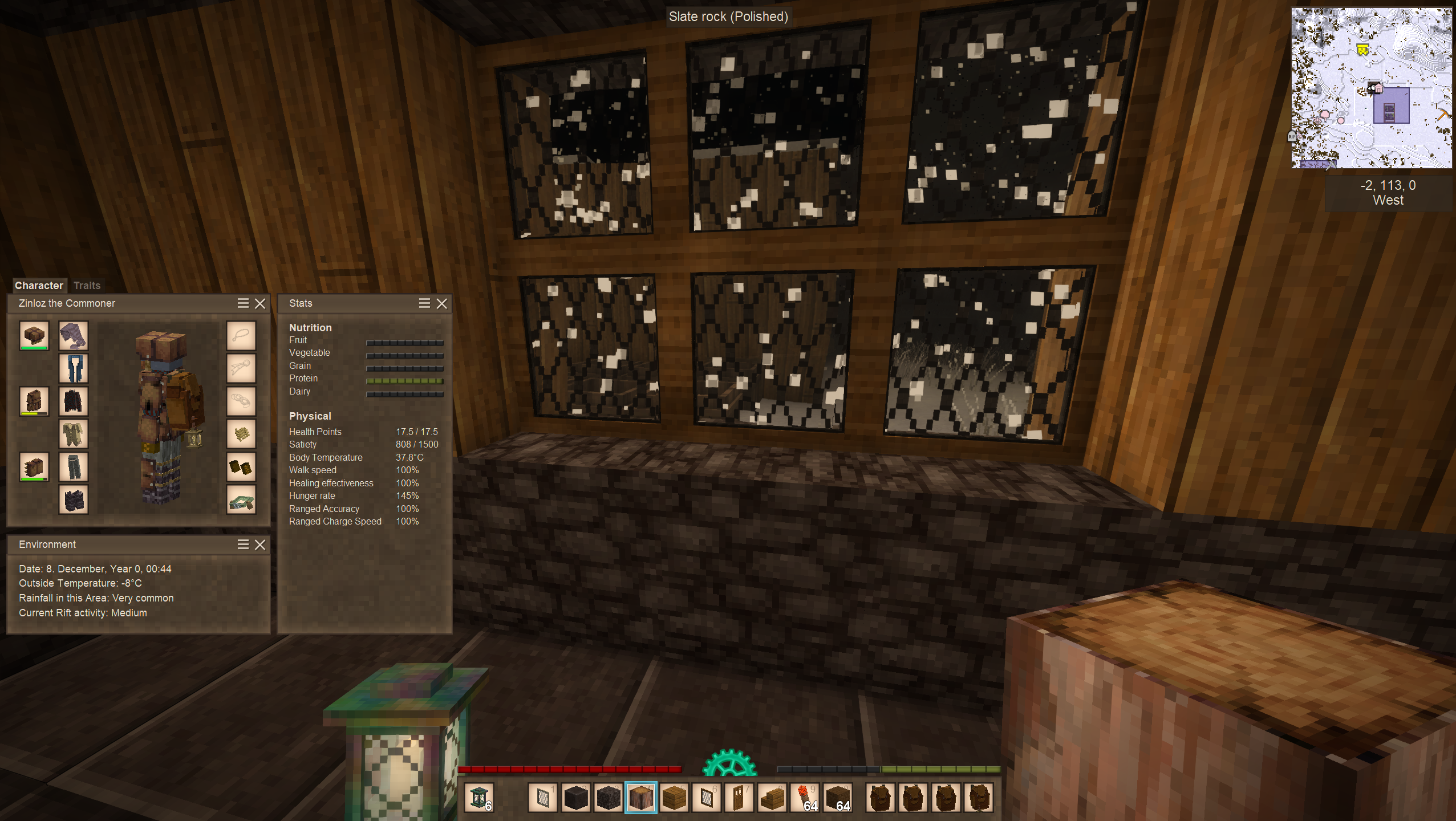 As can be seen in the screenshots, there is some weird stuff going on with room recognition. The "back" wall (meaning furthest from the front door) seems to be just outside of the detection range. And the back window, if I stand on top of the first wall block, is being counted as its own room (windowroom screenshot shows this). This isn't just a visual thing with the debug tool, as you can see my hunger rate from the floor and what should be "inside" the room is 145, but only 120 when I stand on the window sill.