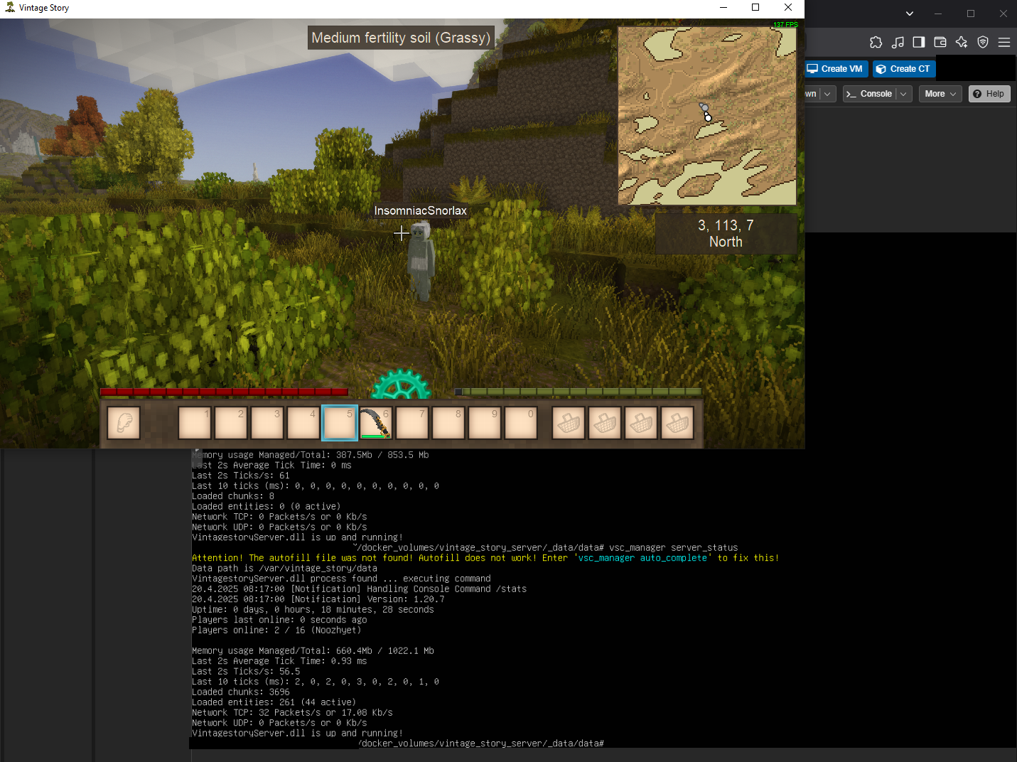 BarenAD Posted December 23, 2023 Report Posted December 23, 2023 (edited) Hello everybody! I share my practices, which may be useful. My task was to assemble a minimal image (on alpine, this is in progress, the vanilla server is working, but there are problems with some mods), as well as all kinds of automation (automatic backups of the world, installation and updating: servers, containers, mods (as much as it can be simplified)) See the full instructions of your choice and stay tuned on the GitHub repository page! The image is uploaded to the repository, you don't have to build it (unless you want to change something. So far, the container is made on the basis of ubuntu:22.04. If you encounter any problems or have any other ideas on how to improve it, please report it here! Required install Docker! QUICK STARTING Spoiler Step 1: Install VCS (VINTAGE STORY CONTAINER) manager (need wget). See actual version by GitHub Repository! sudo wget -O /usr/local/bin/vsc_manager https://github.com/BarenAD/docker_vintage_story/releases/download/vsc_manager_1.3.0/vsc_manager && sudo chmod +x /usr/local/bin/vsc_manager Step 2: download image and start container vsc_manager container_install Step 3: Choose version. min 1.18.8 (for now). I'll take the latest version as an example. A container on the 'linux' distribution. We need the 'linux' options tar.gz '. and run: vsc_manager server_update Step 4: restart container or server vsc_manager container_restart Step 5: Done! Checking! CONFIGURATION Spoiler Step 1: Create link to volumes and install MC to server (not in container). sudo ln -s /var/lib/docker/volumes /root/docker_volumes Step 2: Go to path data server and open configuration use editor (i use MC) su - cd /root/docker_volumes/vintage_story_server/_data/data/ && mc Select and press F4 for change I changed welcome message Step 3: Restart container vsc_manager container_restart Step 4: Done, checking... INSTALL MODS Spoiler Step 1: Choose mod here For example taken this (copy download link archive) Step 2: vsc_manager server_mod_install Manager checking on exist file and remove after alert old version. Step 3: Restart container vsc_manager container_restart Step 4: Done. Checking! BACKUPS Spoiler They are automatically created every day at 00:00. But you can make a backup immediately. IMMEDIATE BACKUP: (example for real server, the size of the world is big there ) (My script compresses backups by default. See the difference) vsc_manager server_backup Edited December 29, 2023 by BarenAD update link for vsc_manager. 3