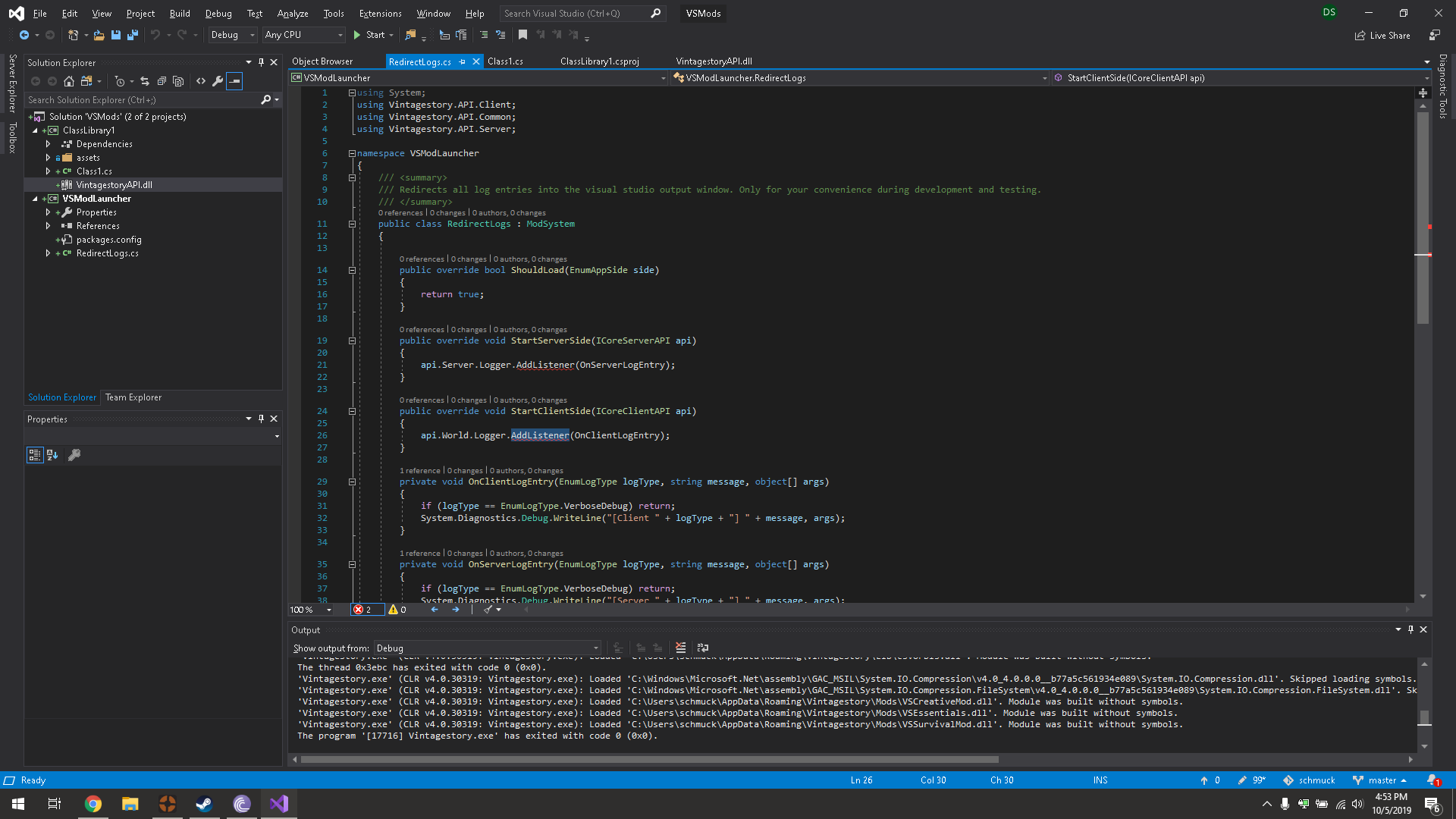 schmuck Posted October 5, 2019 Report Posted October 5, 2019 After following the wiki page on setting up the programming environment, I find errors that I do not understand whatsoever, included is the output log and an image of code and location of the issue. Help is much appreciated... 'Vintagestory.exe' (CLR v4.0.30319: DefaultDomain): Loaded 'C:\Windows\Microsoft.Net\assembly\GAC_64\mscorlib\v4.0_4.0.0.0__b77a5c561934e089\mscorlib.dll'. Skipped loading symbols. Module is optimized and the debugger option 'Just My Code' is enabled. 'Vintagestory.exe' (CLR v4.0.30319: DefaultDomain): Loaded 'C:\Users\schmuck\AppData\Roaming\Vintagestory\Vintagestory.exe'. Module was built without symbols. 'Vintagestory.exe' (CLR v4.0.30319: Vintagestory.exe): Loaded 'C:\Users\schmuck\AppData\Roaming\Vintagestory\VintagestoryAPI.dll'. Module was built without symbols. 'Vintagestory.exe' (CLR v4.0.30319: Vintagestory.exe): Loaded 'C:\Users\schmuck\AppData\Roaming\Vintagestory\VintagestoryLib.dll'. Module was built without symbols. 'Vintagestory.exe' (CLR v4.0.30319: Vintagestory.exe): Loaded 'JfedRdilEmGTPAXhfovzRjfQeGzjc'. Module was built without symbols. 'Vintagestory.exe' (CLR v4.0.30319: Vintagestory.exe): Loaded 'C:\Users\schmuck\AppData\Roaming\Vintagestory\Lib\CommandLine.dll'. Module was built without symbols. 'Vintagestory.exe' (CLR v4.0.30319: Vintagestory.exe): Loaded 'C:\Windows\Microsoft.Net\assembly\GAC_MSIL\System.Windows.Forms\v4.0_4.0.0.0__b77a5c561934e089\System.Windows.Forms.dll'. Skipped loading symbols. Module is optimized and the debugger option 'Just My Code' is enabled. 'Vintagestory.exe' (CLR v4.0.30319: Vintagestory.exe): Loaded 'C:\Windows\Microsoft.Net\assembly\GAC_MSIL\System\v4.0_4.0.0.0__b77a5c561934e089\System.dll'. Skipped loading symbols. Module is optimized and the debugger option 'Just My Code' is enabled. 'Vintagestory.exe' (CLR v4.0.30319: Vintagestory.exe): Loaded 'C:\Windows\Microsoft.Net\assembly\GAC_MSIL\System.Drawing\v4.0_4.0.0.0__b03f5f7f11d50a3a\System.Drawing.dll'. Skipped loading symbols. Module is optimized and the debugger option 'Just My Code' is enabled. 'Vintagestory.exe' (CLR v4.0.30319: Vintagestory.exe): Loaded 'C:\Windows\Microsoft.Net\assembly\GAC_MSIL\System.Core\v4.0_4.0.0.0__b77a5c561934e089\System.Core.dll'. Skipped loading symbols. Module is optimized and the debugger option 'Just My Code' is enabled. 'Vintagestory.exe' (CLR v4.0.30319: Vintagestory.exe): Loaded 'C:\Users\schmuck\AppData\Roaming\Vintagestory\Lib\OpenTK.dll'. Module was built without symbols. 'Vintagestory.exe' (CLR v4.0.30319: Vintagestory.exe): Loaded 'C:\Users\schmuck\AppData\Roaming\Vintagestory\Lib\Newtonsoft.Json.dll'. Module was built without symbols. 'Vintagestory.exe' (CLR v4.0.30319: Vintagestory.exe): Loaded 'C:\Windows\Microsoft.Net\assembly\GAC_MSIL\System.Numerics\v4.0_4.0.0.0__b77a5c561934e089\System.Numerics.dll'. Skipped loading symbols. Module is optimized and the debugger option 'Just My Code' is enabled. 'Vintagestory.exe' (CLR v4.0.30319: Vintagestory.exe): Loaded 'C:\Windows\Microsoft.Net\assembly\GAC_MSIL\System.Runtime.Serialization\v4.0_4.0.0.0__b77a5c561934e089\System.Runtime.Serialization.dll'. Skipped loading symbols. Module is optimized and the debugger option 'Just My Code' is enabled. 'Vintagestory.exe' (CLR v4.0.30319: Vintagestory.exe): Loaded 'C:\Windows\Microsoft.Net\assembly\GAC_MSIL\System.Xml.Linq\v4.0_4.0.0.0__b77a5c561934e089\System.Xml.Linq.dll'. Skipped loading symbols. Module is optimized and the debugger option 'Just My Code' is enabled. 'Vintagestory.exe' (CLR v4.0.30319: Vintagestory.exe): Loaded 'C:\Windows\Microsoft.Net\assembly\GAC_MSIL\System.Xml\v4.0_4.0.0.0__b77a5c561934e089\System.Xml.dll'. Skipped loading symbols. Module is optimized and the debugger option 'Just My Code' is enabled. 'Vintagestory.exe' (CLR v4.0.30319: Vintagestory.exe): Loaded 'C:\Windows\Microsoft.Net\assembly\GAC_64\System.Data\v4.0_4.0.0.0__b77a5c561934e089\System.Data.dll'. Skipped loading symbols. Module is optimized and the debugger option 'Just My Code' is enabled. 'Vintagestory.exe' (CLR v4.0.30319: Vintagestory.exe): Loaded 'C:\Users\schmuck\AppData\Roaming\Vintagestory\Lib\protobuf-net.dll'. Module was built without symbols. 'Vintagestory.exe' (CLR v4.0.30319: Vintagestory.exe): Loaded 'C:\Users\schmuck\AppData\Roaming\Vintagestory\Lib\xplatforminterface.dll'. Skipped loading symbols. Module is optimized and the debugger option 'Just My Code' is enabled. 'Vintagestory.exe' (CLR v4.0.30319: Vintagestory.exe): Loaded 'C:\Users\schmuck\AppData\Roaming\Vintagestory\Lib\cairo-sharp.dll'. Module was built without symbols. 'Vintagestory.exe' (CLR v4.0.30319: Vintagestory.exe): Loaded 'C:\Windows\Microsoft.Net\assembly\GAC_MSIL\System.Configuration\v4.0_4.0.0.0__b03f5f7f11d50a3a\System.Configuration.dll'. Skipped loading symbols. Module is optimized and the debugger option 'Just My Code' is enabled. 'Vintagestory.exe' (CLR v4.0.30319: Vintagestory.exe): Loaded 'C:\Users\schmuck\AppData\Roaming\Vintagestory\Lib\csogg.dll'. Module was built without symbols. 'Vintagestory.exe' (CLR v4.0.30319: Vintagestory.exe): Loaded 'C:\Users\schmuck\AppData\Roaming\Vintagestory\Lib\csvorbis.dll'. Module was built without symbols. The thread 0x3ebc has exited with code 0 (0x0). 'Vintagestory.exe' (CLR v4.0.30319: Vintagestory.exe): Loaded 'C:\Windows\Microsoft.Net\assembly\GAC_MSIL\System.IO.Compression\v4.0_4.0.0.0__b77a5c561934e089\System.IO.Compression.dll'. Skipped loading symbols. Module is optimized and the debugger option 'Just My Code' is enabled. 'Vintagestory.exe' (CLR v4.0.30319: Vintagestory.exe): Loaded 'C:\Windows\Microsoft.Net\assembly\GAC_MSIL\System.IO.Compression.FileSystem\v4.0_4.0.0.0__b77a5c561934e089\System.IO.Compression.FileSystem.dll'. Skipped loading symbols. Module is optimized and the debugger option 'Just My Code' is enabled. 'Vintagestory.exe' (CLR v4.0.30319: Vintagestory.exe): Loaded 'C:\Users\schmuck\AppData\Roaming\Vintagestory\Mods\VSCr