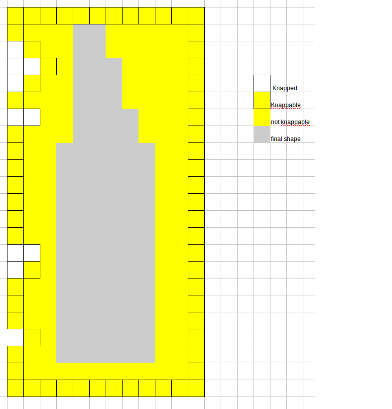 Simon Stapley Posted December 2, 2019 Report Posted December 2, 2019 At present when you knap stone you can just cut out around immediately close to the final shape and it looks like you should be able to pick it up and leave the remaining stone on the floor. I think it would be better if to begin with you only had the edge of the square showing yellow voxels and as you chip away they expose more edges and then more yellow as appropriate. Just quickly thinking it through I would have thought that making it have rules along the lines of you can knap if the outer voxel is exposed or the two on either side are either exposed or could be exposed. I have attached a quick diagram of how I see it working, but haven't checked that it would definitely would work without errors. May need a bit more refinement but hopefully would be a bit more like how one would knap stone in real life. Pieman