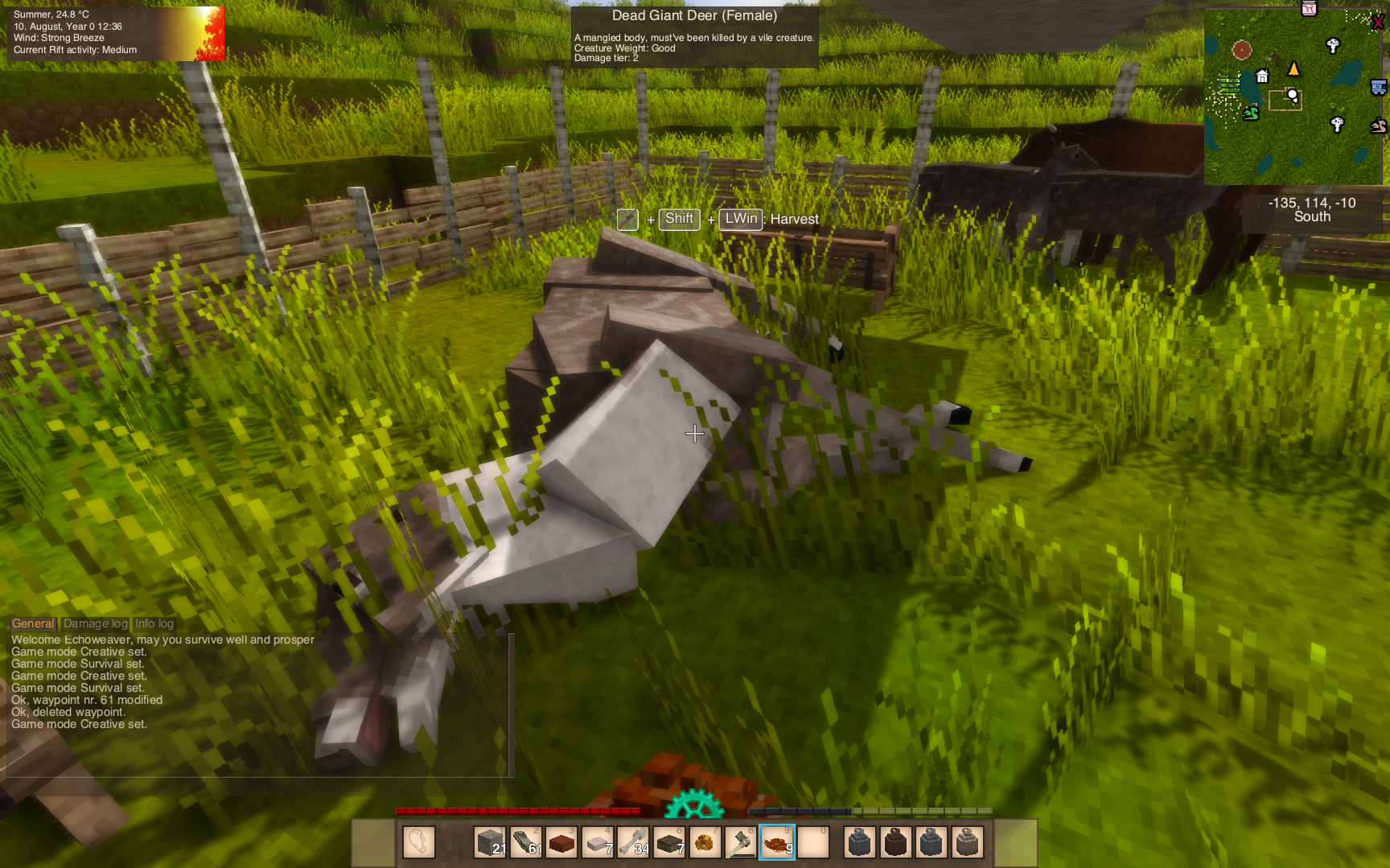 Echo Weaver Posted October 18, 2025 Report Posted October 18, 2025 (edited) In today's episode of Extreme Animal Husbandry, Echo tries to find a mate for the three(!) giant deer calves (fawns?) in her pen. There used to be several giant deer roaming about, all female. As the leaves start turning for fall, I can only find one, but she's been sticking around. In fact, no matter where I chase her to, I was always finding her back in approximately the same spot. I'd find her, then I'd chase her back to my base, which I could actually do with impressive precision... just not quite precise enough to send her into the pit trap I had waiting in hopes that she or something else interesting would fall in. I'd give up and head to bed, then I'd go back looking for her a couple of days later, and she'd be back in that same spot across the valley . I was at this every few days all August, and it wasn't working. I decided to try the bola mod. If I read it correctly, I could immobilize her for a short time, and I think I would be able to tie her with a rope to extend that immobilzation to 80 seconds during which time I could fence her in. So I did the usual chase and got her into my neighborhood. Then, when she calmed down and started grazing, I'd sneak up and throw a bola at her. My aim is terrible. Of course, I'd never used this thing before, so I didn't exactly expect better. I don't have a sense of how far I can throw it or how high I need to aim. That's why I had a lot of them. I did hit her once, but then I got tangled in my inventory and didn't rope her, and she got up and ran away. Argh. OTOH, she ran toward my base, which wouldn't be a bad thing. I watched her approach the trough of grass I had laid out beside the pit trap. Keep in mind, I've had this setup all summer, and she's been by before but not fallen in. I caught those three giant dear babies using these traps, but the aurochs needed extra encouragement to fall in. I watched this doe walk right up at to edge of the trap and sit down to nap once. It feels like their routing is taking the trap into account, but I can't be sure. This time I was ready. I sneaked around behind, hugging the mountain to stay as far away from her as possible. Then I ran at her, and she fell in! So I put all that work into figuring out bolas, and she fell into a trap instead. Next lesson: I knew these creatures have a 3(!) block jump, but somehow it didn't occur to me that the catwalk I had added above the pen to interact with the aurochs without being gutted is 3 blocks up. She did not get away, thank God, but she did jump up and walk along it before I chased her off and knocked it down. So, breeding pairs of both species, which was my goal. The auroch cow is pregnant. I hope her calf will be "partially-tame" as named in the FotSA files, and that this means it won't freak out when I get into line-of-sight. I'm going to revisit the bola when it's time to cull the older generation because I'm going to need all the help I can get to kill one. When it comes time to butcher one of these things, I guess I'll get a good start on compost because I don't think I can possibly eat all the meat before it goes bad, even in winter. Edited October 18, 2025 by Echo Weaver 4