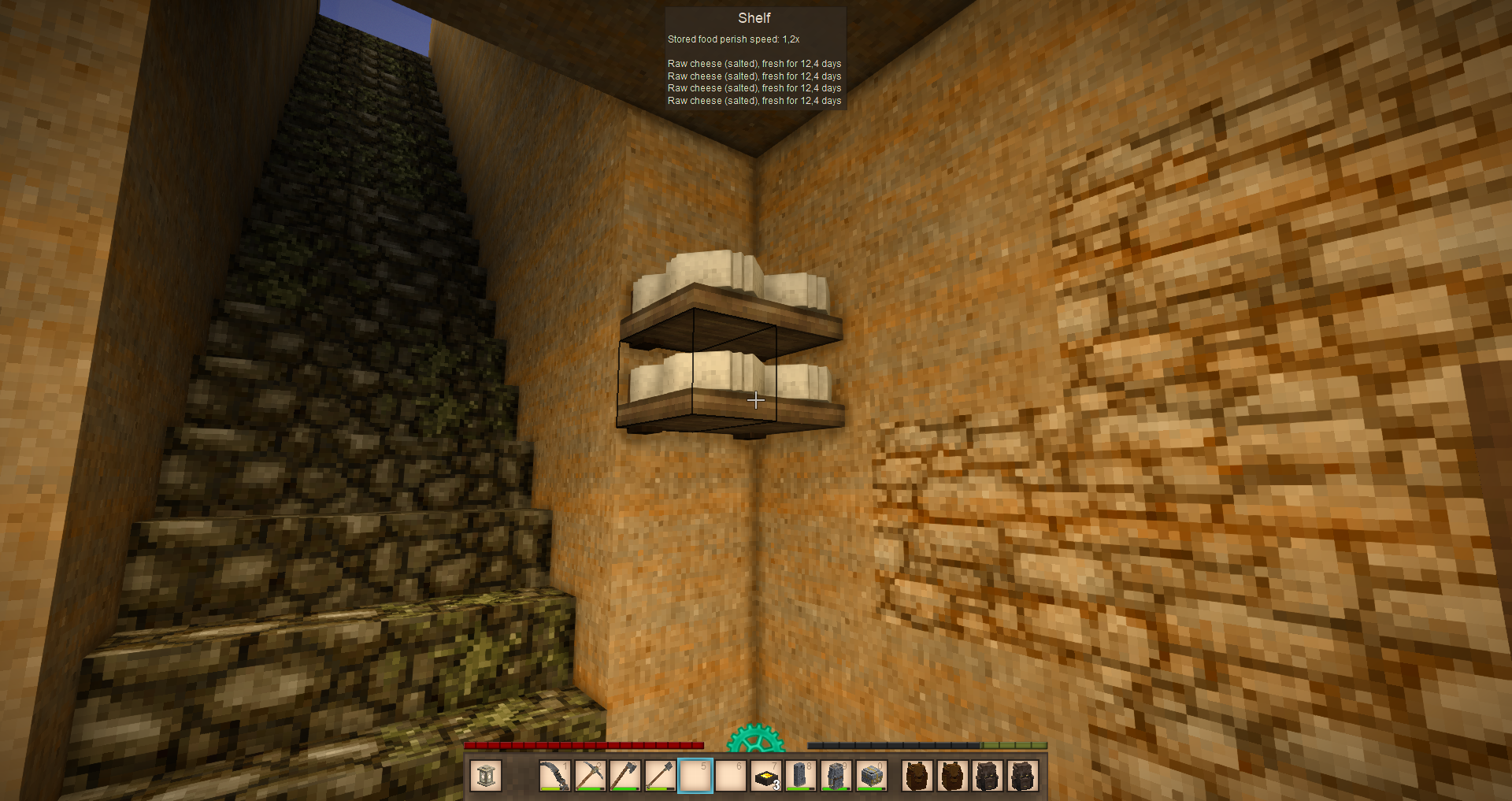 BokuDesuNe Posted December 20, 2025 Report Posted December 20, 2025 (edited) Indeed, it appears that all you have to do is remove ALL access to sunlight while providing access to open air. Here is a quick guide: ====================== VINTAGE STORY STEP-BY-STEP GUIDE TO RIPEN BLEU CHEESE ========================= 0. Only attempt to craft bleu cheese in cold environments or winter when there are at least 2 months of sub-freezing temperatures left. (Bleu cheese has to ripen in an unsealed environment, i.e., outside of a cellar. Unless the air temperature is cold enough, raw cheese wheels may spoil before they fully ripen.) 1. Dig or secure a cave, and leave the entrance open. You can block off the entrance with "open" blocks like fences or fence gates 2. Build enough walls in the cave to create twists and turns that reduce the DAYLIGHT at the back of the cave to 0. Check this by removing any artificial lights during the middle of the day and ensure that there is a spot where the cave is almost pitch black. Note: this part is best to do when temporal rift activity is CALM. (See Figure 1, below.) 3. Build a few wooden shelves in the dark spot. Now you can replace any artificial lights. 4. Craft some raw cheese wheels and place them on the shelves. Note: They don't have to be crafted in an area without sunlight, but they have to ripen in an area without sunlight and with open air access. 5. Wait until the raw cheese wheels ripen (a little more than 14 days depending on the temperature) and you will have fresh wheels of bleu cheese! (See Figure 2, below.) Figure 1: Cave with light level 0 in the DAYTIME. This is the spot to ripen bleu cheese. Figure 2: Bleu cheese ripening success! Hmm... I wonder if raw cheese can be ripened partially indoors, but either finish or start the process outdoors, and still produce bleu cheese. This would allow bleu cheese to be produced in warmer conditions. Edited January 4 by BokuDesuNe 1 1