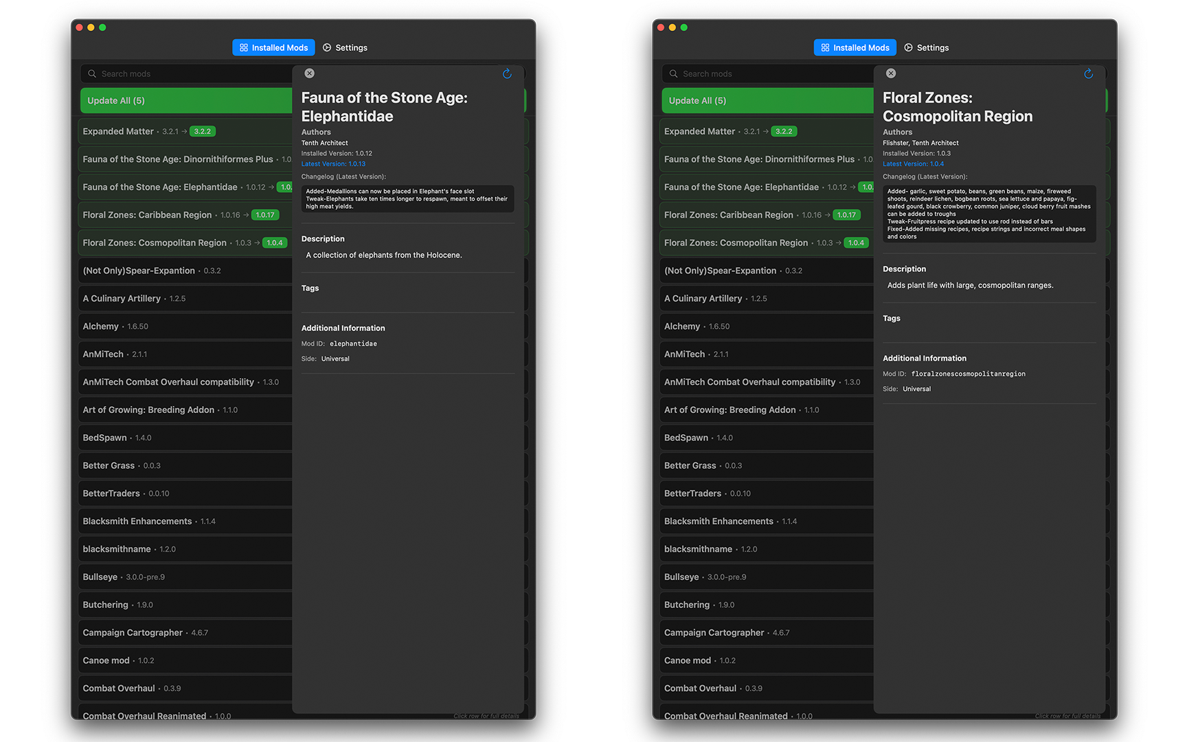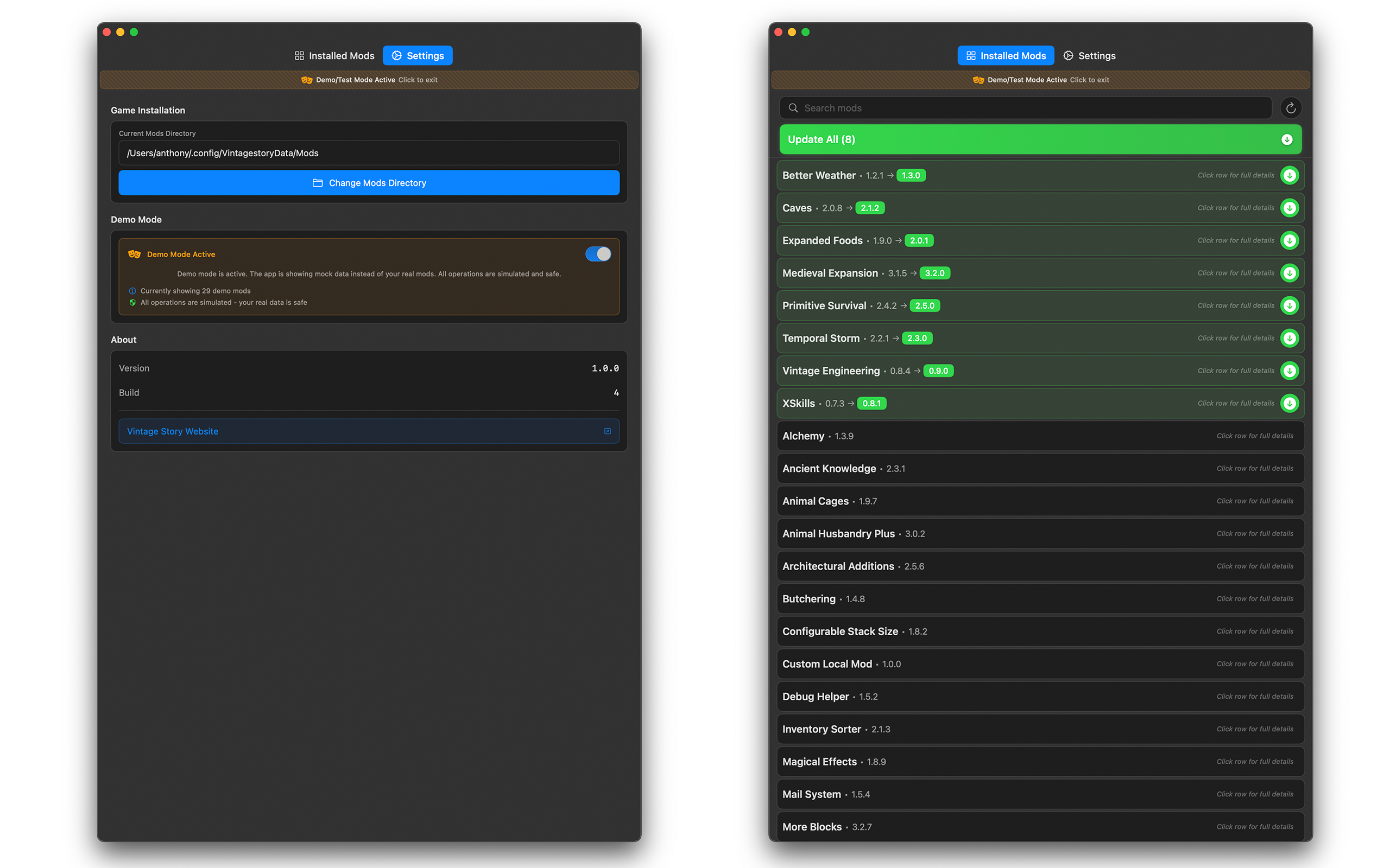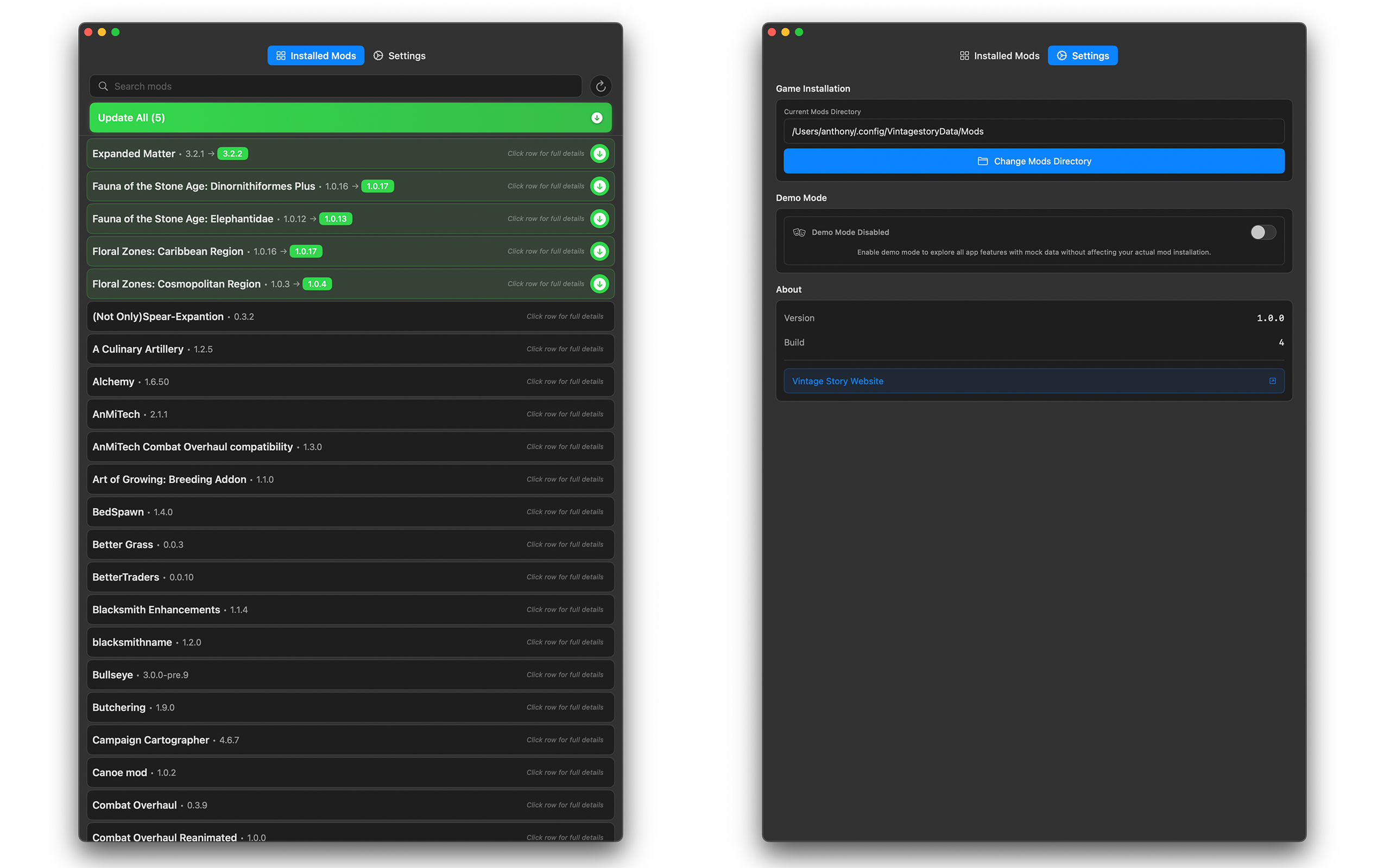 advion Posted June 12, 2025 Report Posted June 12, 2025 (edited) # ModStory A native MacOS Vintage Story Mod Manager * This is an Apple Disk Image (.dmg) in a zip file You must unpack it and move it to your Applications folder. This does not go into your VS Mods folder it is a standalone third party application * https://mods.vintagestory.at/modstory https://github.com/advion/ModStoryApp ## Overview ModStory helps you manage your game mods by providing a relatively easy to use interface for viewing, and updating your installed mods. ## Features - Update Checking: Automatically check for available updates for your installed mods - One-Click Updates: Download and install mod updates with a single click or update only the ones you choose - Detailed Mod Information: View mod descriptions, changelogs, tags ## Roadmap - Better UI - Ability to browse mods and install straight from the app - More robust JSON parsing and API matching - Ability to exclude mods from updates - App update checking - Apple App Store release ## Requirements - macOS 15.0 or later - Vintage Story game installation ## Usage 1. Launch the application - This is an Apple Disk Image in a zip file. Unpack and mount the .dmg and drag it to your Applications folder. Unmount the disk image then you can delete the dmg and zip. Load the app from your Applications folder. 2. Select your mods directory in the Settings page 3. Browse your installed mods, click them for detailed information and change logs 4. Download and install updates by hitting Update All or individually If you have issues with finding or updating mods go into Settings and choose your mod directory again. This app is Sandboxed and can only read/write into the folder you set as the mod directory. ## Disclaimer - This is my first Swift/SwiftUI app and was basically just cobbled together as a learning experience. It is very flawed still. Edited June 14, 2025 by advion 1