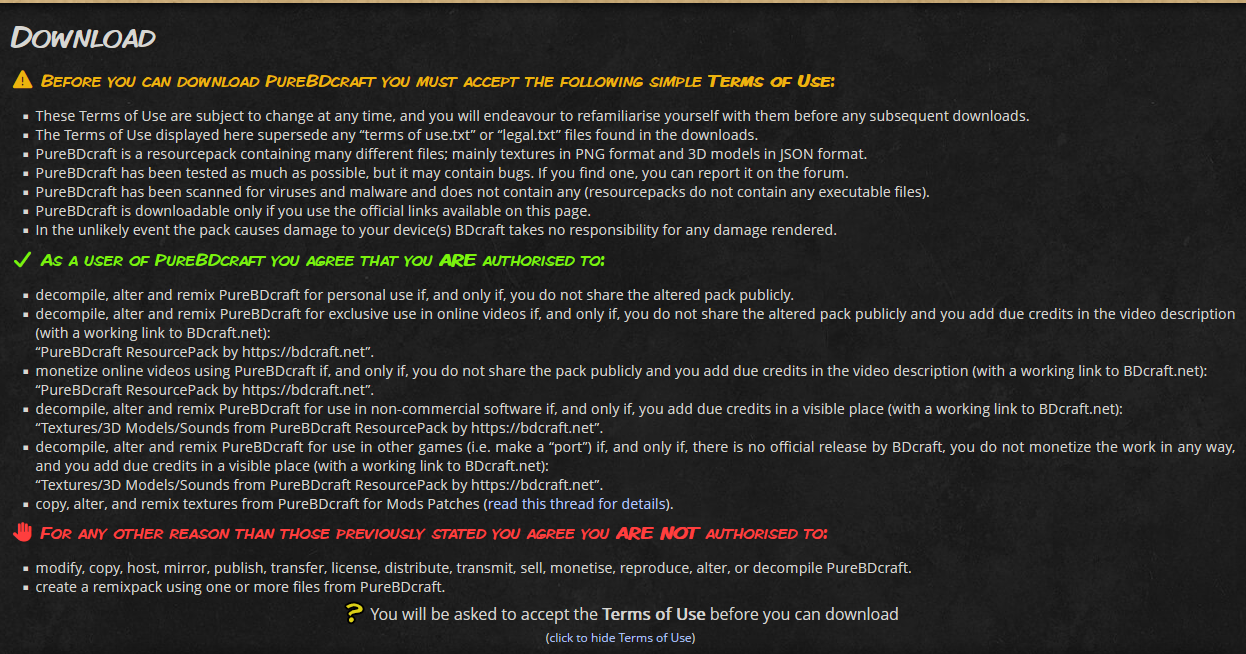 LadyWYT Posted August 18, 2025 Report Posted August 18, 2025 30 minutes ago, Diff said: I'm not seeing a direct BDcraft similarity, although the vibes are there. Maybe it's something like style transfer? The ore and stone textures are a dead giveaway. Sphax PureBDCraft has a specific cartoon style that uses a lot of sharp edges, pentagons, and flat colors in its textures. Some of the textures still seem to be vanilla VS(but upscaled), so I'm guessing it's probably a mix of VS textures, Sphax, and possibly textures from elsewhere that have been mixed in as well. Which...given that Sphax PureBDCraft has some specific TOS, may or may not present a problem depending on what the user intends to do with the work.