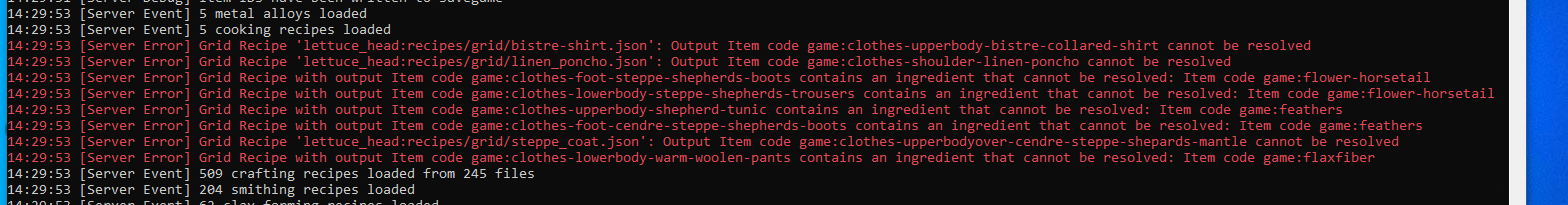 jakecool19 Posted January 10, 2021 Author Report Posted January 10, 2021 1 hour ago, Michael Wendt said: when i load my server i get this error, everything runs and its new server so i cant really test what this will cause for issues. im assuming its from this mod as its all clothing recipes. I am sorry but that is not from my mod, it does nothing clothing related. The problem is, whatever mod is adding these recipes are not using the right item codes. For example game:flower-horsetail does not exist it should be game:flower-horsetail-* or game:flower-horsetail-free.