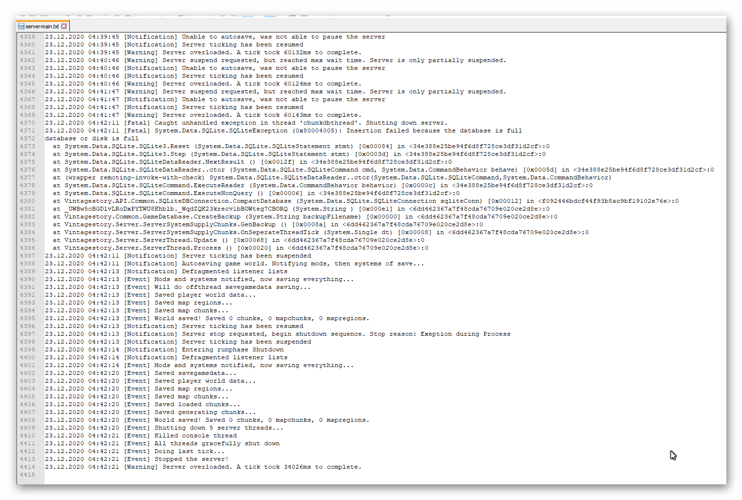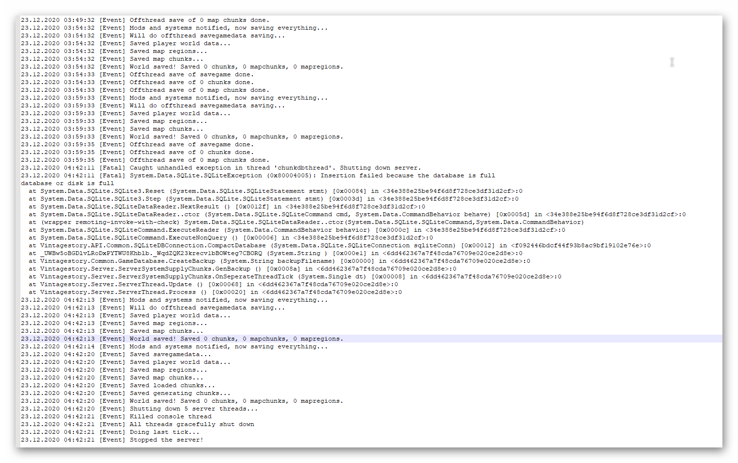 DrEngine Posted December 23, 2020 Report Posted December 23, 2020 We do have experienced server crash last few mornings: - we have configured DB backup every morning; last three backups have the same size (thats weird: they should have different sizes - new backup more or less bigger); - server crashes every morning; reason: exception SQLite - database or disk full; there is no record concerning backup start before; - harddisk has sufficient space (circa 25 GB free); - game play (at least generated chunks) is intact and we do have all player builds etc made before crash; See printscreens... This seems like potentially very serious issue. Please help !!!