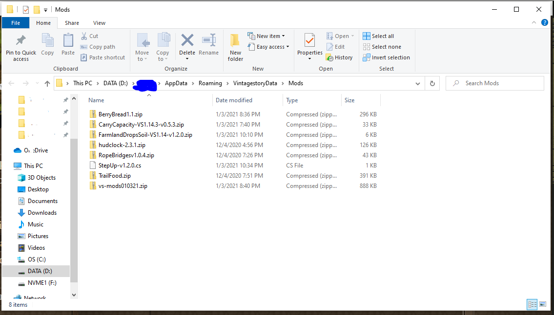 Hexalan Posted January 17, 2021 Report Posted January 17, 2021 Environment: VS 1.14.5 on Windows 10 Problem: Due to disk space issues I moved my AppData/Roaming directory to another drive using Win10's folder location setting and let Windows move all the data. While all of my save data and other settings are fine the mod path setting is not updated to the new location (see ModManger-pre-edit.png). Clicking on the "Open Mods Folder" in Mod Manager does open the correct folder and the mods are present (modsfolder.png). I looked at clientsettings.json and found that the modPath is not updated and still points to the old directory: "modPaths": [ "Mods", "C:\\Users\\XXXXX\\AppData\\Roaming\\VintagestoryData\\Mods" ], Work around performed: Shut down VS. Edited the clientsettings.json file and changed the value of modPaths to the correct location under the moved AppData/Roaming location: "modPaths": [ "Mods", "D:\\XXXXX\\AppData\\Roaming\\VintagestoryData\\Mods" ], Restarted VS. The game client then picked up the mods correctly and seems to be working fine. Desired behavior: Provide the user with an editable save data location and make modPaths follow that setting. This would be my preference but that may break Windows' conformance crap. or Change the way modPaths is set to use the system location for %AppData%\\Roaming so that a move of the folder are followed correctly. *I'm not a coder and these are just my thoughts, there are probably better ways to fix it!* Thanks for creating such a great game!