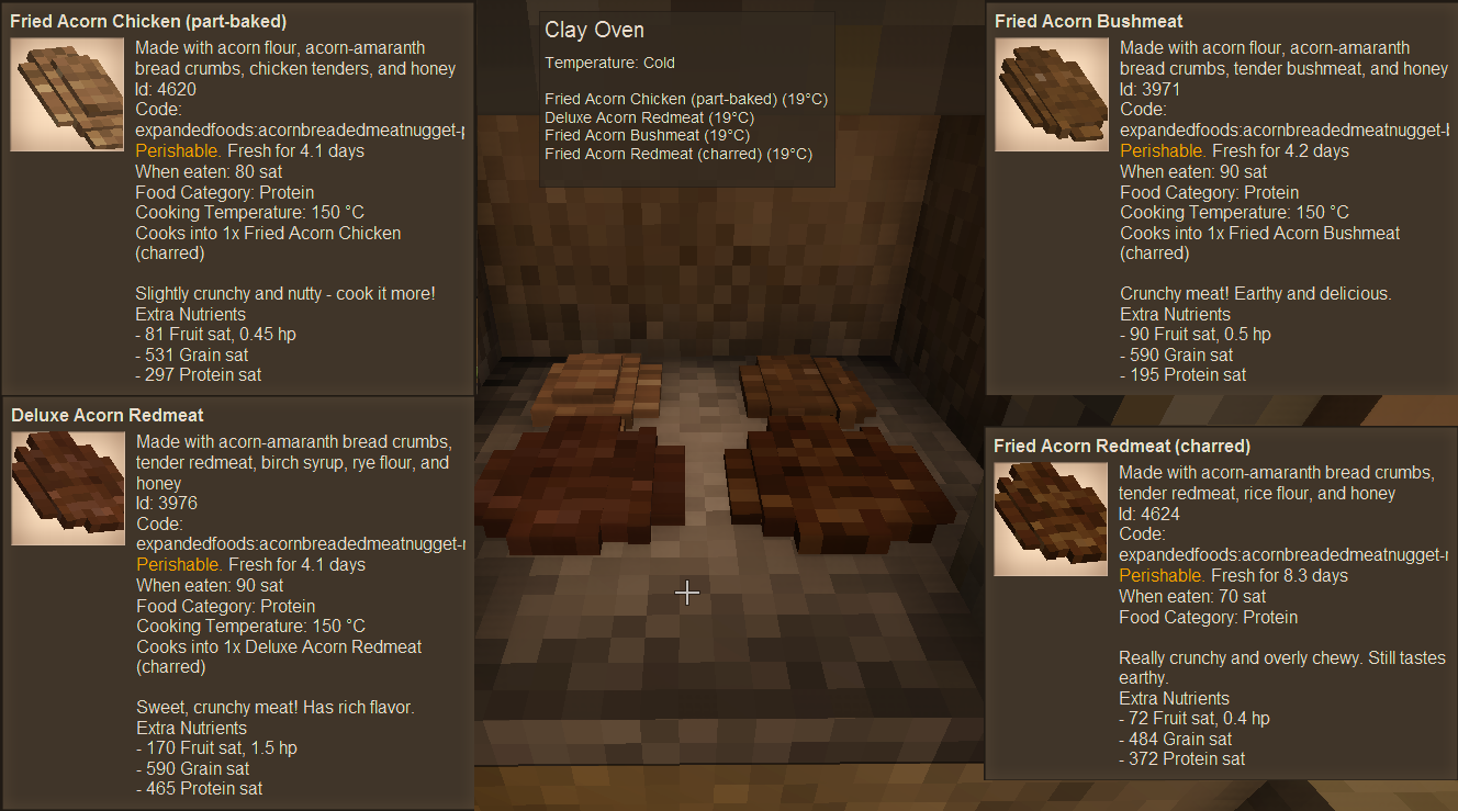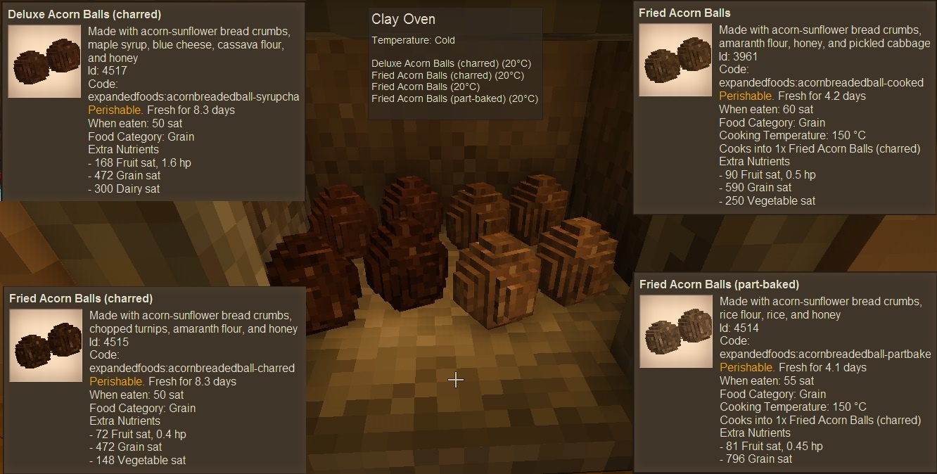 l33tmaan Posted August 10, 2021 Author Report Posted August 10, 2021 (edited) Updated to 1.4.0!THIS MOD HAS BEEN HEAVILY OVERHAULED SINCE PRE 1.4.0 RELEASES. YOUR COOKED VEGETABLES WILL NOT PORT OVER! EAT THEM WHILE YOU CAN! Updated to 1.15+! Many foods now compatible with clay oven (Vegetables/Chopped Vegetables; Aged Meat/Meat nuggets/Regular Meat; Fruit; Soaked Soybeans; Hardtack; Seaweed) [Fried Balls; Fried meat; Fried veggies; Soft Bread; Dumplings; Muffins; Pemmican; Sausage; Berry Bread; Gozinaki] Items updated with new vegetables (Cooked/Chopped/Cooked Chopped veggies; Juice; Soup meal; Gelatin) [Bell peppers pushed off till later] [Fried Balls; Fried veggies; Sushi] Items updated with new fruit (Dried fruit; Juice/Wine/Syrup; Yogurt; Gelatin; various meals) [Muffins; Pemmican; Berry Bread; Gozinaki] Updated bread items to include new flour types (Bread crumbs; Hardtack) [Fried Balls; Fried meat; Fried veggies; Soft Bread; Dumplings; Muffins; Pasta; Berry Bread] Bushmeat, Cured meat, mushrooms, gelatin, chopped food, sausage, raw eggs can be used in pies Pies are now EXPANDED - fillings can be mixed in any way and soft dough/herbal dough can be used as a crust Seaweed cooking process expanded to require the quern and clay oven for processing Aged meat nuggets and seaweed can be added to soup Seaweed can be added to salad Hot pasta now actually carries over noodle nutrition Soft resin curing time cut to 18 days Cured meat nuggets available in pemmican recipe Re-added Boiled Egg (Thanks, Tyron...) Liquid portions downsized Handbook guides redone; recipes and items made more explicit Curing no longer multiplies nutrition Regular cooked cattail/papyrus roots disabled Mixing bowl made easier to select Screwpress updated with new wood types Handful of Acorns changed from Vegetable to Protein New pasta, seaweed, & sushi textures (thanks to @Ledyanaya Sonya) I still need to redo the original post, but I just couldn't wait on releasing it anymore. Enjoy and tell me what bugs you find! Edited August 10, 2021 by l33tmaan 3