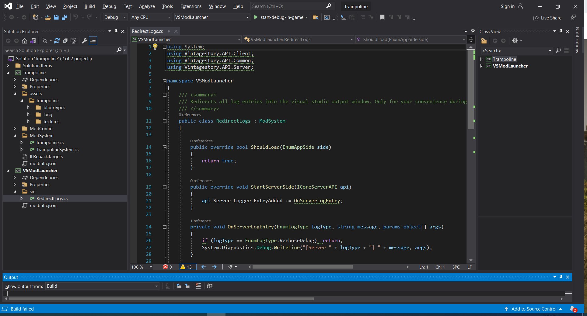 Spear and Fang Posted June 17, 2021 Report Posted June 17, 2021 (edited) Let me talk briefly about debugging. In the first example (where you put your mod directly in the mods folder), debugging is hard. Either the game crashes and you get a pop-up explaining why, or the issues are logged into C:\Users\<user>\AppData\Roaming\VintagestoryData\Logs, or both. I always start by looking at server-main.txt In the second example, the VSModLauncher intercepts a lot of that stuff and pukes it out into the Output - Debug window, so you can see what's going on behind the scenes while the game is running. That's really all that VSModLauncher is doing which is why you can promptly ignore it. You can add logging to your own code as well, i.e. System.Diagnostics.Debug.WriteLine("This variable:" + thisvariable); Edited June 18, 2021 by Spear and Fang 3