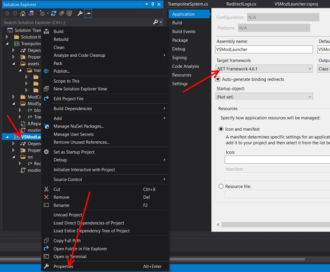 Spear and Fang Posted June 17, 2021 Report Posted June 17, 2021 (edited) So let's talk about the trampoline mod in particular. At the bottom of that page, download the for VS v1.9 version of that. Now you can drop that zip file directly into your mods folder (C:\Users\<user>\AppData\Roaming\VintagestoryData\Mods ) and take it for a spin, but since the code isn't compiled (no .dll files), I like to unzip it first and drop THAT unzipped folder into the Mods folder instead. Fire up Vintage Story, check the Mod Manager to ensure that the Trampoline mod has loaded successfully. Start a new Single Player game (creative world), grab a couple of Trampolines and try them out. Since the folder is unzipped, it's easy to point your favorite editor at that folder (Visual Studio Code works great for this), and quickly make changes to code, assets, whatever, save them, and see what happens when you restart the game. CTRL-F1 for a quick restart. Sometimes I save and exit to retain the stuff that I've been mucking with in game. You can do almost anything imaginable with code, so I can't possibly dive too deeply into that. But a common use for code is attaching it to assets, just like the trampoline does. If you look at trampoline.json, there's a class:"trampoline" that links the TrampolineBlock class to the trampoline.json asset. That link is finalized by registering the class (usually in the Start function) api.RegisterBlockClass("trampoline", typeof(TrampolineBlock)); In the json file, not only can you specify a class, but you can also link an entityclass, and one or more behaviors if need be. Those all need to be registered in your Start function, but slightly differently depending on what they are, i.e api.RegisterBlockBehaviorClass("RightClickPickupSpawnWorm", typeof(RightClickPickupSpawnWorm)); api.RegisterBlockEntityClass("bedeadfall", typeof(BEDeadfall)); api.RegisterItemClass("itemcordage", typeof(ItemCordage)); api.RegisterEntity("entityearthworm", typeof(EntityEarthworm)); The wiki talks about the purposes of these different classes so I'm not going to go into that. ---------------------------------------------------- If we want to migrate this trampoline mod into Capsup's template (so we can do a deep dive into the code, use modern c#, debug, automatically create deliverables, and more)...https://gitlab.com/vsmods-public/foundation/vsmodtemplate 1. Setup Visual Studio as per Cap's instructions 2. Start a new project using his template 3. I like to use a location that's not nested so deep, so like C:\repos 4. Go with the defaults after that. 5. Once the solution is loaded up, it might be easiest to close Visual Studio and use File Explorer to move the stuff in. In this case it's really only the contents of the assets folder. So move the trampoline folder from C:\Users\<user>\AppData\Roaming\VintagestoryData\Mods\Trampoline_vs1.9_v1.0.0\assets to C:\repos\Trampoline\Trampoline\assets The folder structure inside of assets has lots of naming conventions. See the wiki for that, or look at the the folder structure of the vanilla survival mod, or any other mod. 6. Copy the trampoline.cs file from C:\Users\<user>\AppData\Roaming\VintagestoryData\Mods\Trampoline_vs1.9_v1.0.0\src to C:\repos\Trampoline\Trampoline\ModSystem The structure of your c# files has no rules. You can put all the code in one file (like the trampoline mod does), but I like to break it up into a bunch of files, and even nest some of those files into folders based on what the code is doing. 7. Now delete the entire trampoline mod (Trampoline_vs1.9_v1.0.0) from your mod folder C:\Users\Administrator\AppData\Roaming\VintagestoryData\Mods If you leave that in there, or ever have two copies of the same mod accessible to the game at once you're in for a world of hurt. 8. Fire up Visual Studio again and open your trampoline project. You might see two projects (Trampoline.sln and Trampoline1.sln). Remove that Trampoline1.sln from your recent list. I don't know what the hell that is. My Visual Studio looks like this. I've expanded a bunch of folders on the left so you can get a look at what's where. 9. The first thing I *like* to do is tidy up RedirectLogs.cs so it doesn't complain about anything. Then I collapse the VSModLauncher folder structure and never look at it again. All of the "issues" are highlighted. Visual Studio can walk you through most of the changes (i.e. hover, click on "show potential fixes", go with the first option). Here's the result after the cleanup. No more green squiggles. Save that. namespace VSModLauncher { using Vintagestory.API.Client; using Vintagestory.API.Common; using Vintagestory.API.Server; /// <summary> /// Redirects all log entries into the visual studio output window. Only for your convenience during development and testing. /// </summary> public class RedirectLogs : ModSystem { public override bool ShouldLoad(EnumAppSide side) { return true; } public override void StartServerSide(ICoreServerAPI api) { api.Server.Logger.EntryAdded += this.OnServerLogEntry; } private void OnServerLogEntry(EnumLogType logType, string message, params object[] args) { if (logType == EnumLogType.VerboseDebug) { return; } System.Diagnostics.Debug.WriteLine("[Server " + logType + "] " + message, args); } public override void StartClientSide(ICoreClientAPI api) { api.World.Logger.EntryAdded += this.OnClientLogEntry; } private void OnClientLogEntry(EnumLogType logType, string message, params object[] args) { if (logType == EnumLogType.VerboseDebug) { return; } System.Diagnostics.Debug.WriteLine("[Client " + logType + "] " + message, args); } } } 10. A bit of an aside. Before you click the "start-debug-in-game" button to test things out, make sure that VSModLauncher is selected (see picture below). Never change that dropdown. Also, when you are ready to create your deliverable to share with the world, change the Debug dropdown to ReleaseAndZip. Then when you click the "start-debug...." button it will create your finished product