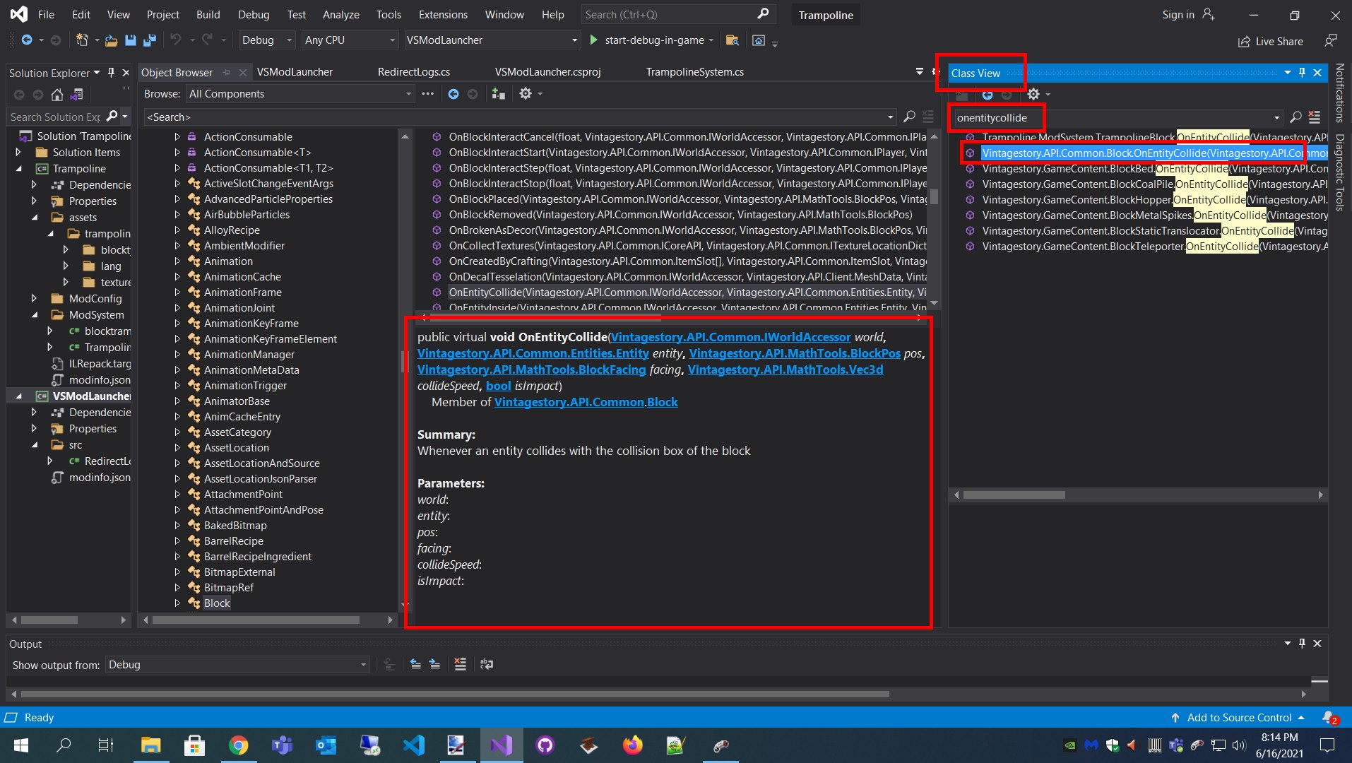 Spear and Fang Posted June 17, 2021 Report Posted June 17, 2021 (edited) Here's a clue: The TrampolineBlock iinherits Block public class TrampolineBlock : Block And then we are overriding OnEntityCollide... public override void OnEntityCollide So if you search for onentitycollide in the Class View, we can get the deets... Edited June 17, 2021 by Spear and Fang 2