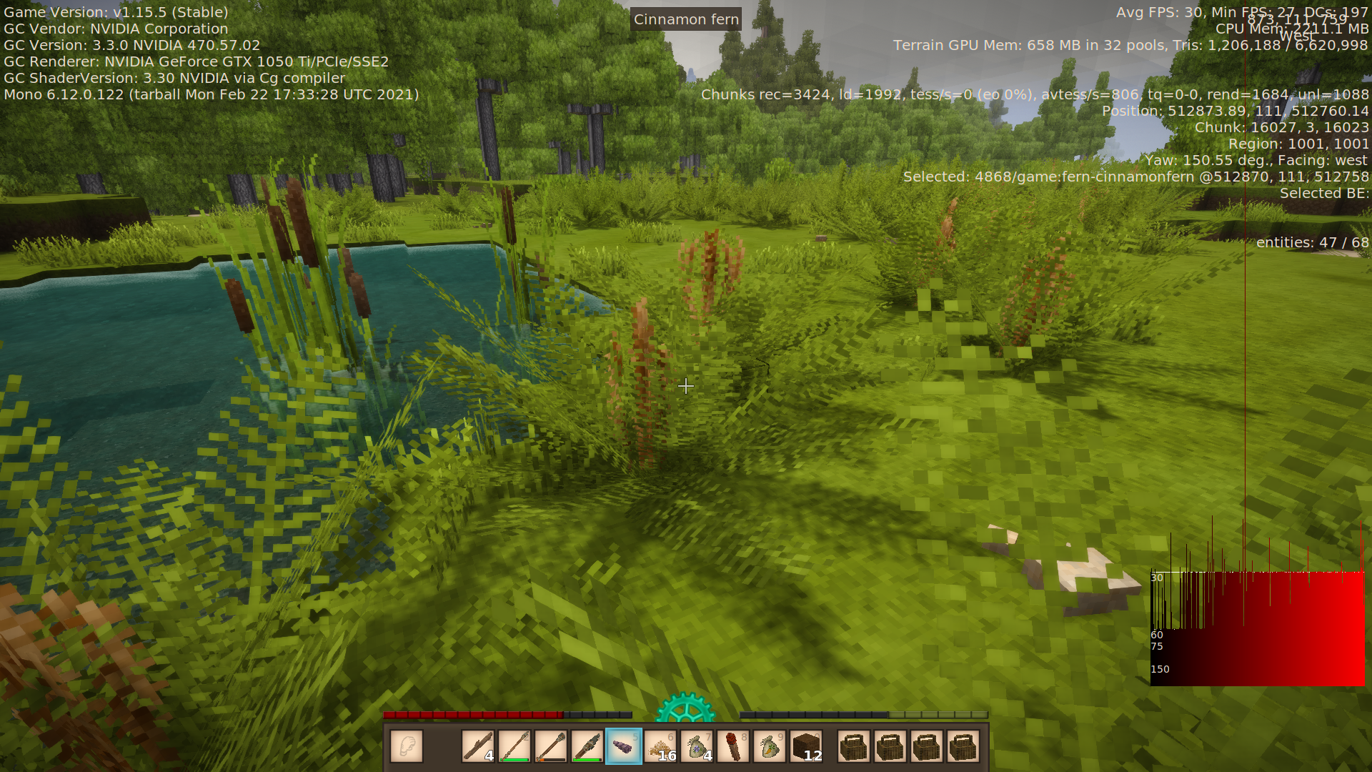 David Petersen Posted September 4, 2021 Report Posted September 4, 2021 Hello, I’m having some performance issues and hope to figure out if this is something that can be fixed or whether it is simply a hardware issue on my end. To be more specific, the issue I’m having is some very large and often lethal lag spikes. I’m ok with running the game at an average 30FPS as the official system requirements suggests I should be able to, but I’m not too happy about having these lag spikes occur. Here is the report; The type of lag: Overally low framerate, short or long lag spikes? Depending on the graphics settings, but at high settings I can average around 30-60 FPS, depends on what I do in the game. I know that doesn’t make any sense, but that is what the number in the top right corner says(ctrl + F3). I guess the AVG number is an average of the FPS over a short amount of time?! The spikes are high/long on the graph but short in duration. Meaning the FPS drops a lot for a short time. Is it Client or Server lag: Client lag symptoms: The framerate will be low or the screen will be frozen for short or longer durations. The screen will freeze for 1-2 seconds. The frequency depends on graphics settings, especially the viewing distance, but even on the lowest viewing distance I still get these lag spikes. Server lag symptoms: A disconnected icon on the top right corner, have blocks reappearing, animals not moving, broken blocks taking a while before their drops appear The issue occurs on a singleplayer map. If its client lag Whats the framerate and fps graph look like? (hit CTRL+F3 to see) See the attached Screen shot - Nr. 1 and Nr. 2 Whats your graphics settings and what graphics card and RAM capacity do you have? I have mostly played with high settings, but have tried to lower it. Like I mentioned above, the spikes still occur at lower settings although it is less frequent. The screenshots and data supplied are all from high settings. I have turned the Occlusion culling off, but I see no difference whether it is on or off. I have 8GB of memory. My GPU is a NVIDIA Corporation GP107 [GeForce GTX 1050 Ti] Whats the current memory usage? How long have you been playing? Is it single player or multiplayer? I have played for nearly 10 hours on this map. The total memory usage is around 6.5 – 7.0 GB out of 7.74 available (see screenshot - Memory usage) It is a singleplayer map. Make a screenshot of the frame profiler output (hit CTRL+F10 to toggle). Before screenshotting please also type the command .edi to get additional frame profiler output. See screenshot Nr. 3 On just individual lag spikes, please run the command .debug logticks 20 if you are usually above 60 fps, or .debug logticks 40 if you are usually above 30 fps. Let it run for a while and then send us the client-main.txt, it's found in %appdata%/VintagestoryData/Logs. Run the same command again to disable the logging. Please make sure that here too, extended debug info (via .edi) is enabled. I’m unsure how to perform this step?! I ran the command, but don’t know how to run it on individual lag spikes. I don’t know where the log file is located. I am on Linux Mint 20 Cinnamon. I tried looking in /home/[username]/.local and the /home folders but without any luck. Please clarify and I will provide the log ASAP. Pc Specs OS - Linux Mint 20 Cinnamon I installed the game via the official instructions using Mono. CPU - Intel© Pentium© CPU G4560 @ 3.50GHz × 2 GPU - NVIDIA Corporation GP107 [GeForce GTX 1050 Ti] nvidia-driver-470 Version 470.57.02-0ubuntu0.20.04.1 Memory 8GB Harddrive - 1TB HDD(plenty of free space) I hope this helps. Egnaar