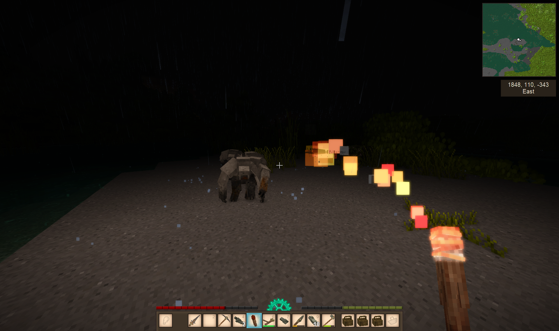 It takes like 30 hits to kill them with the torch and they deal like an 8th of your health if they hit you. Even if you do kill them, another one will spawn in its place. Notice how I have half my health missing? That's from when I thought it was a good idea to try and fight back, yeah it didn't work. Even if I did have a proper weapon, it's going to break in like 4 kills anyway which is going to require I stay put for a bit to, oh wait there's 2 more now I have to deal with. -