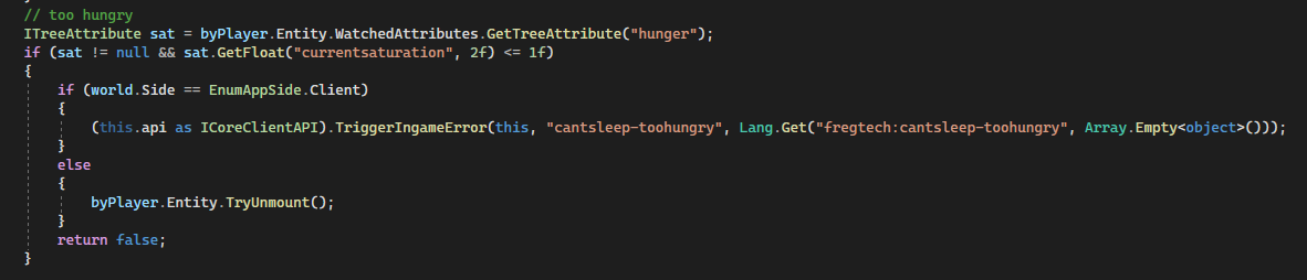 23. Dark, my man! I've been sniffing around in that behavior before, but I was only there to see how to get the saturation level. I would never have thought there was such a connection (through the watchedattributes)... oooh thank you!!! God knows how much time you saved me! Now... on to climb the next mountain; Making all players wake up if you run out of saturation while sleeping. And that (from what I can tell based on my limitied knowledge so far) doesn't seem possible without overriding the entire ModSleeping since it references BlockEntityBed in its WakeAllPlayers method. Meaning I must extend BlockEntityBed with my BlockEntityFTBed. And in BlockEntityBed are two cruicial methods i need to override (DidMount and DidUnmount) because the ticklistener is created there. But these methods are not marked as virtual, so I can't override them ...I was so close.