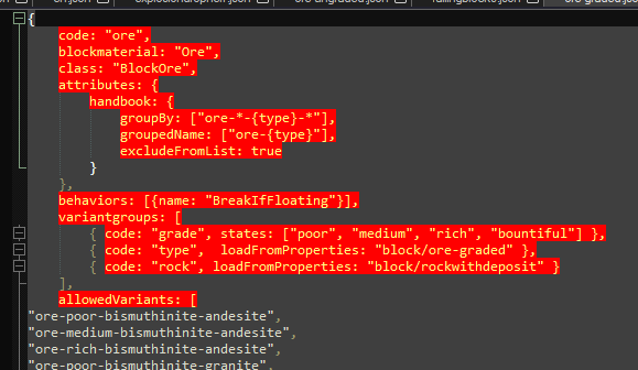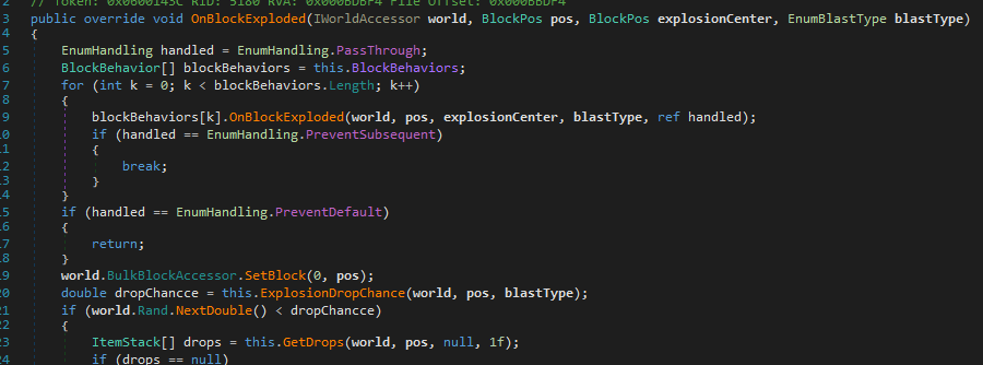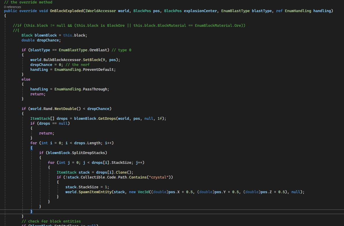 10. This is driving me crazy! I thought it was solved, but apparently not... it's a simple behavior, from what I can see it SHOULD work, but it's not... BlockBehaviorExplosionDropNerf : BlockBehavior I've removed checks for type of block (which should be quite redundant anyway since the behavior is only patched into ore-gem, ore-graded and ore-ungraded), I've set dropChance to 0. Tried removing the BlastType check. Hell, I even tried removing all code and just having handling = EnumHandling.PreventDefault; return; PreventDefault should stop the drops, right??? But they still drop their loot! It's like the behavior is not even added at all. PatchExplosionDropNerf Vanilla ore-graded The already present behavior, 'BreakIfFloating' can't have anything to with it, right? Vanilla BlockOre Again, if I set handled = EnumHandling.PreventDefault in my behavior, it should stop the drops?
