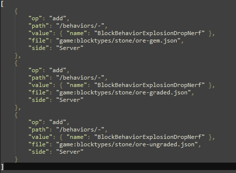 21. I didn't know you could target a specific entry (or line or whatever it's called) within a "{ } -list". So if I understand this right, the op's behave like the following in a case like this (with /texturesByType) : add: adds a new entry at the end (we can't target a specific index since it's not an [ ]-array). and I can't use this command since "*" comes before my added line, making it unreachable? or is add only used to add a new property that isn't already present, e.g. /combustibleProps? replace: simply replaces the entire section. again, we can't target any specific entries? move: this one actually CAN target a specific entry. (/move on "*"). so I could (if I wanted) use it to move e.g. "*-flint"? remove: removes entire section (/textureByType). again, we can't target any specific entries?