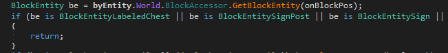 18. So I've made a labeled trunk. Everything works fine, except for using pigment (say charcoal) on the right part/block of the trunk. Instead of opening the write-text-gui, it piles the charcoal on the ground in front of the chest. My entity (BlockEntityFTTrunkLabeled) is derived from the BlockEntityLabeledChest, so it shouldn't do that, at least not in ItemPileable... It so strange since I can open the trunk on both the left and the right block, that interaction works fine. But I can only trigger the write-text-interaction on the left. I've checked and compared the code a hundred times over, but I just can't find the error. It must be something either in the OnPlayerRightClick method: or in my json-file (which is basically a mash of the vanilla chest-trunk and chest-labeled I've paid extra attention to the multiblock behavior and collisionSelectionBox, but I guess it's not that since interaction (opening the trunk) works as expected. full BlockEntityFTTrunkLabeled class (if it helps)