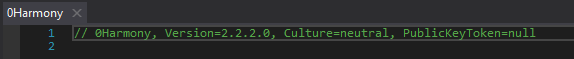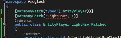 17. So I've started looking into Harmony now. I copied some code from another mod with the intent to experiment with it. First thing I get is an error from just copying the over the code: I don't understand why this is not recognized by my compiler (when it obviously works in the original mod). It's a small mod with only one ItemClass, the mod core class, and this EntityPlayer_LightHsv_Patched class. Ok, it also comes with a config class, which I skipped. But can't see that the config should have anything to do with this error. Anyway, we are both refencing the same 0Harmony.dll ...or so I think, there were a bunch of 0Harmony-dll's in the package I downloaded. I'm referencing the net6.0 version (tried them all with the same result). What is this second parameter, "1"??? My compiler doesn't want it there.