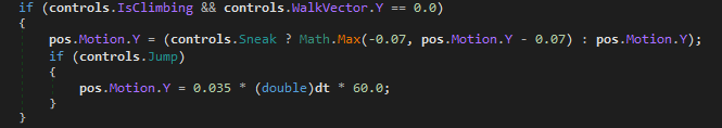 5. If it's not too much of a hazzle.... It would be nice for climbable blocks to have a ClimbSpeed property in the json. Perhaps functioning as a (float) multiplier. And then just multiply the motion.Y in the EntityBehaviorControlledPhysics.DisplaceWithBlockCollision. here perhaps? This would be very useful for future addons (and for modders) of alternative ways of Y-transportation, which I'm sure will come. .... ok, I'm just tired of climbing up and down 90 blocks on a vanilla ladder