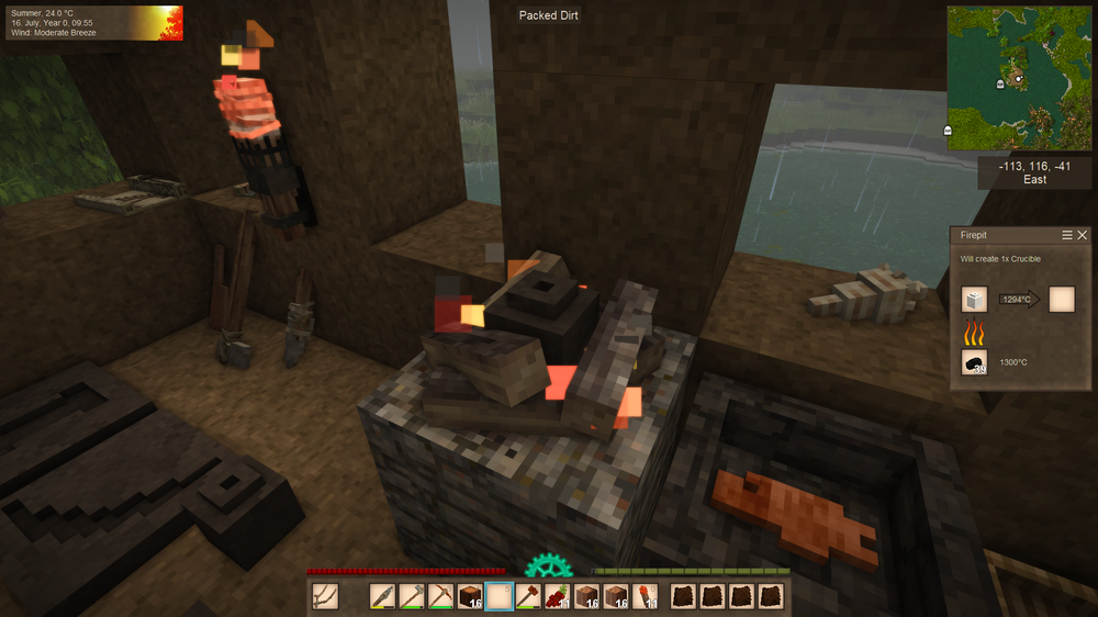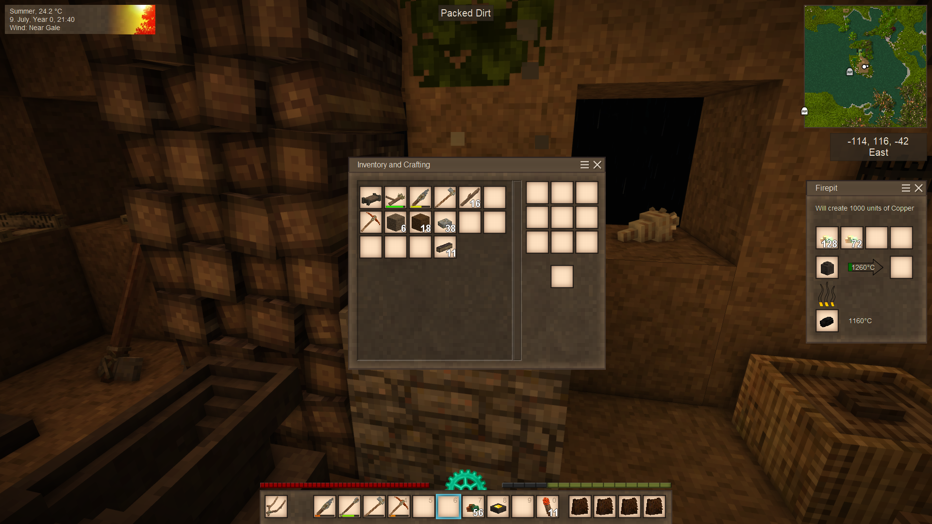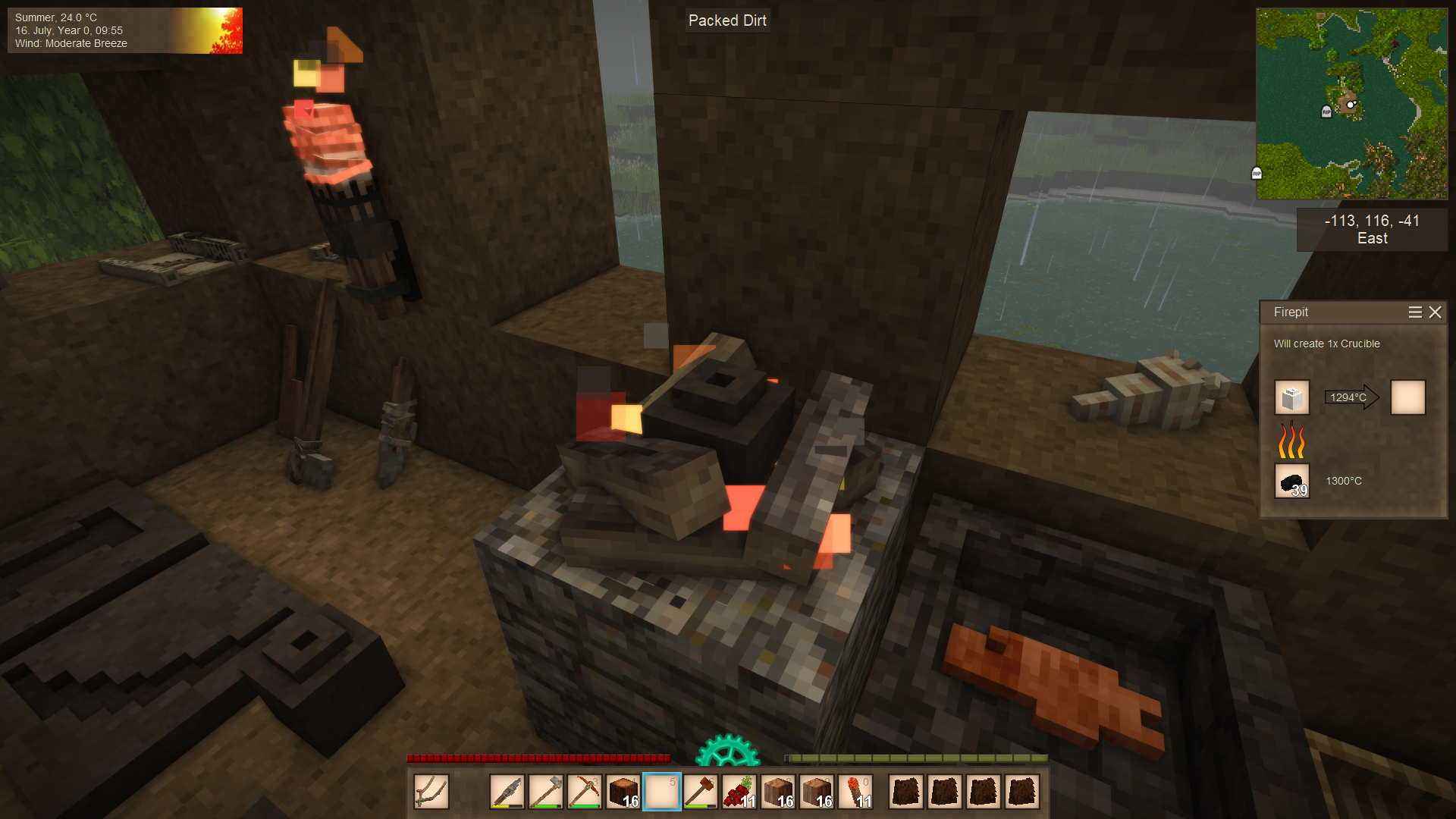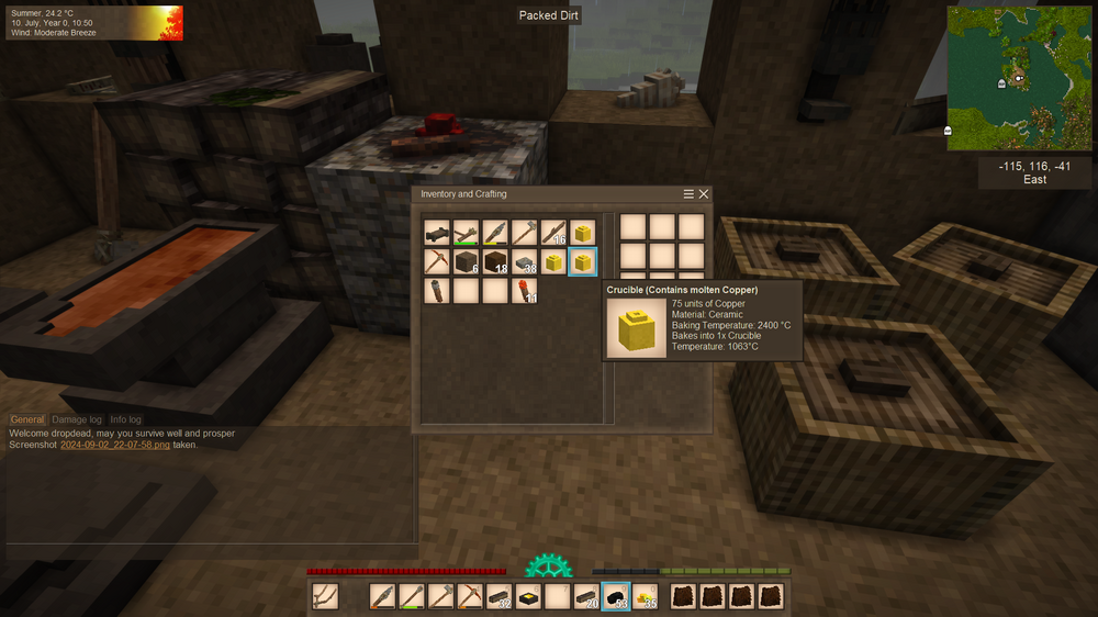 Hello, I am having a hard time to cast anything in Vintage Story. Since I use a handful of mods, this might be related. After I've put my copper nuggets into the crucible, I heat it up with some wood, and change to charcoal after that. The problem now is, that the copper just won't melt when it reaches 1084° Hello, I am having a hard time to cast anything in Vintage Story. Since I use a handful of mods, this might be related. The first copper things I cast, worked well, I made a copper pickaxe and a prospecting pick. The hammer, however, was a bit more difficult, but still worked. Then I started to make an anvil and tried to cast two copper bars, but had a hard time getting them full. Now, when I am trying to progress, it goes something like this: I put my copper nuggets into the crucible, heat it up with some wood, and change to charcoal after that. The problem now is, that the copper just won't melt when it reaches 1084° Celsius. The more copper, the longer it takes (which seems sensible so far). When I put in say about 50 copper nuggets, the temperature starts rising. Near the temperature to cast, the green bar should appear and rise steadily, until the crucible is hot enough, and appears in the right slot, to take it out. But when the green bar shows, the temperature goes steadily up, without showing the progress in the bar, until it reaches 1300° Celsius, gets to white-hot and nothing else happens. If I take out the half of it, it might suddenly pop over, to be used, but this doesn't always work. And casting with miniscule amounts is more than annoying. I already have three crucibles with left in copper, which I just can not smelt again. It doesn't seem to make a difference, how I start to heat up the crucible. Sometime, when I burn ridiculous amounts of charcoal, it MIGHT suddenly turn over to be taken out. I use these activated mods: Auto Map Markers Better Ruins Better Traders HUD Clock Knapster Rivers Th3Dungeons Th3DungeonsTopEntrance VS Villages Whole Lotta Tree Seeds In my mod folder are some other mods, which are turned off: Charcoal Pit Door chiseltools Mannequin Stand Prospect Together Scarecrow Spyglass Am I doing something wrong, or is one of the mods known to cause this behavior?
