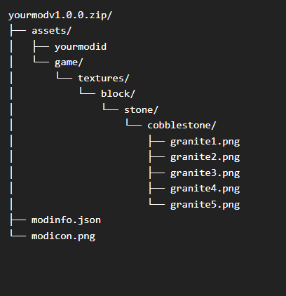 It's still a content mod, unless you plan to provide your own dll with custom classes etc. Yes, this can be done via the Compability api, by having your file replace the vanilla file. CompabilityLib If you want to replace the carrot like in your example above, just place the edited file in you mods asset folder: assets/game/blocktypes/plant/crop/carrot.json Also make sure your modinfo's "side:" is either "server" or "universal". -