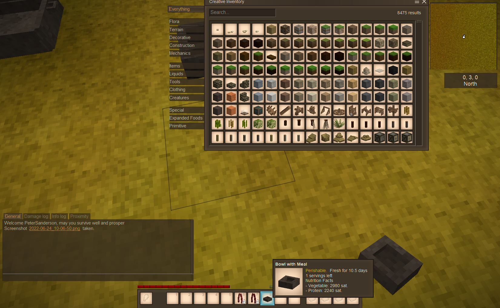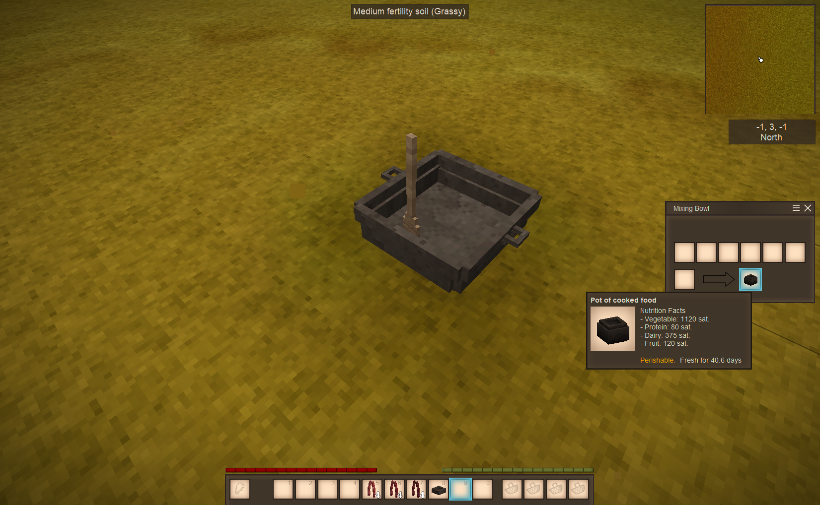 Issues with salad - tested only with Expanded Foods, Primitive Survival, Wildcraft and Wild Farming running, then added More Crops Sausages with salt cannot be added to salads. By design? No textures appearing in bowl or pot for salad. Mixing bowl window identifies it as salad and lists ingredients, but in the pot it shows an ingredients list when you look at it. It only shows as "pot with a meal" in the hotbar. Even just vanilla ingredients show no textures or information (EDIT: Stripped it down to EF and Wildcraft only. Textures were back as is correct recipe information and naming but this stopped. Added in Wild Farming - boom - the errors are there. Removed Wild Farming, errors still there. Deleted world and restarted with just EF and Wildcraft. Errors again. Down to just EF on a new creative world. Still there. Grumble.) In the bowl, either in the hot bar or placed, it is "bowl with a meal" More Crops veg do not work in salad, but do seem to work in the cooking pot (only)