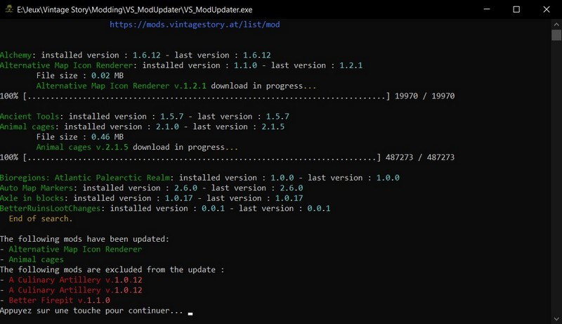9. ModsUpdater Download link What the script does: Creates a "ModsUpdate" folder located in the "VintagestoryData\ModConfig" folder and creates a config.ini file Browses mods folde Extracts the modinfo.json from ZIP-files of each mod into the "temp" folder (created at the root of the program) Compares the version number shown in the modinfo.json and the online one and downloads the mod if the version is more recent. Deletes zip file of the old version mod. Deletes the created 'temp' folder. Detects the language of your system and automatically loads the language file (for now only english and french) if presents in lang directory. If not, english is loaded. You can add yours yourself or send it to me. ** Basic use ** Run the program, you don't have to do anything. The script takes care of comparing the versions of the installed mods and those online and automatically downloads the new versions in the "Mods" folder. **Advanced usage (via config.ini)** The [ModPath] is for those who use VintageLauncher. You have to uncomment the path \VintageStoryModVault and comment \VintagestoryData\Mods in order the program looks for the right mods directory. The [Mod_Exclusion] section allows you to exclude mods from the update process. This is useful for mods with unsupported or unwanted alternative versions. Just add the name of the zip file (with the extension). 1 Mod per line. If you need more than 10 slots just add additional lines to the end : mod11 = mod12 = etc... You may need put some mods in the [Mod_Exclusion] in these situations : - if there is a .net7 version of the mod and you're not running the .net7 version of Vinstage Story. (ex: Better Firepit, A Culinary Artillery) - if there several versions of a same mod (ex : StructuresSpawnChances) PS : If the program closes immediately after launch, that's probably because there is a mod which canot be updated and shoud be put into the [Mod_exclusion] section.. ****************************************************************** I first wrote this program as a programming exercise in Python. And then, as I found it useful, I decided to share it.