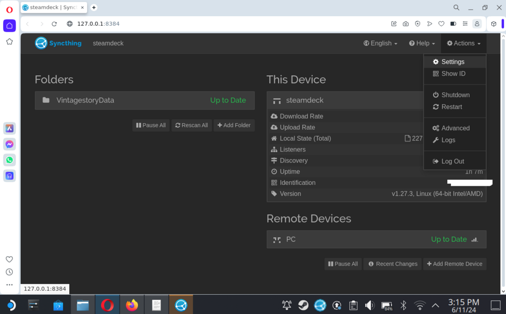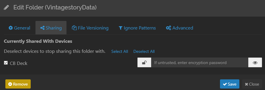 Ok so good news, I managed to get it working with syncthing to sync a folder - though it was a bit of a hassle as all networking things are. Ill format it below in case you either want to link to this message or to just add it to the guide since I figure it might help a fair amount of users that are coming from PC. So before we get into the nitty gritty, lets first talk about whats to be expected and what some alternatives might be. This can be a bit of a setup and things can go wrong that will take a bit of extra time if you aren't careful. I doubt anything will have any huge issues, the worst I ran into was having to reinstall and reconfigure some things or do a fair bit of googling and forum crawling to find a fix. Expectations In case this doesn't really cover what you need, there are some alternatives Host a dedicated server - this fixes practically all of those issues but requires a computer or device to always be hosting this It can be a bit difficult for users to do since it can sometimes get a bit technical, need IP addresses, etc Websites do exist that you can pay to host games like this, but they will need a bit of extra setup if you want to use mods Use some manual file transferring There are some platforms that could help with this like google drive, github, etc. Anywhere that can host a file can cover a use case Problem is that whenever you finish playing, you HAVE to remember to move the files over to the cloud. The nice part is that you can pull the save down whenever and put it up when you are done 99% of this is done by using syncthing though, so doing this method may be a easy fallback but it can be a lot of extra legwork for something computers can do with minimal issue But this use case is probably more useful if you have extremely unreliable access to the internet With that out of the way, lets get down to business. Ill give a bit of a technical overview here - but please know that its just technical mumbo jumbo. I'll do my best to walk through this with a good bit of detail since i already spent one sleepless night figuring this out so it wouldn't be fair to take up your entire night now would it? Basically we are going to use syncthing to create a folder on our PC that we are going to share with out deck. It shares through syncthing-gtk and will go through syncthing (a plugin for decky loader). At the end of the day that means you can leave your pc running sync thing while your deck can have an easy switch to toggle it on/off in gaming mode! So you can do a bit of work here to avoid having to touch desktop mode as much. Now going forward ill use a style in the headers. If it starts with SD we will be using the steam deck for this part. If it starts with PC we will be using your desktop/laptop or really, any other device that can handle syncthing. Its actually a pretty portable piece of hardware, but since I run windows 10, ill keep most of my work down to that platform. Other platforms seem to work very similar especially when using the web UI. SD-Initial Setup SD-Configuring Syncthing-GTK PC-Setup SD-Establishing the connection PC-Sharing the Folder and checking that it works SD-And Voila! Kinda... SD-But you told me this would be seamless That took you a night of suffering? But you promised me more! Where was that cool idea to get around needing both running? So long and thanks for all the fish I hope that was able to help you, if you have any issues feel free to reach out and ask. This can be pretty daunting for people especially those that aren't comfortable with computer mumbo jumbo. I hope you were able to get it working and enjoy the vintage story!