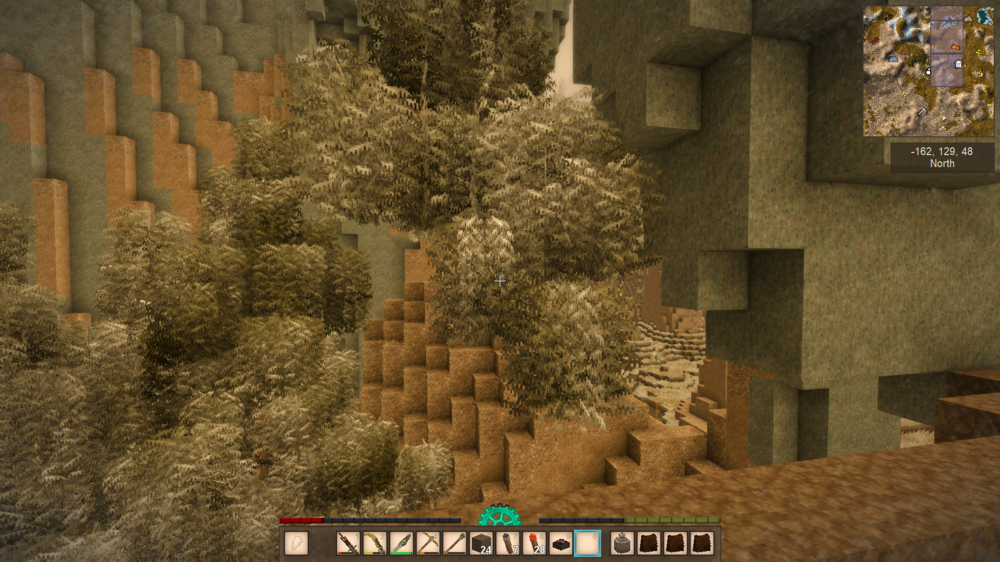 (Pun intended) I had a very tall pine tree grow in a valley next to a spire and I wasn't in the mood to prune the top by hand, so I chopped it down. Imagine my surprise when not all of the tree came down: Those are leaf blocks, holding the treetop onto the rock face horizontally. I think there needs to be some better rules about what makes leaf and branch blocks pop. My proposal is that leaf and leafy branch blocks are considered 'supported' and don't pop if: There is any solid block beneath them. There is an adjacent log block of the same tree type in any direction. There is an adjacent leafy branch block of the same tree type that is 'supported' in any direction (will require recursion over branch blocks to find a base). Essentially, leaf blocks should not support other leaf blocks or branches. If there are two trees close enough that their leaves are touching, cutting down one tree will remove its top, leaving the other's. This may mean adjusting tree generation so that there are more branch blocks for structure but will leave shrubs intact.