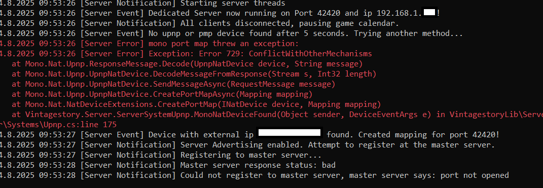 3. Port is open, 42420 is open on tcp and udp ive troubleshot a minecraft server (25565) and that works fine, no issues on there. But, vintage story keeps saying 42420 is closed, local ipv4 works but only on host machine, LAN does not work on connecting devices to the same router. Trying to host from ingame by opening to LAN fails to find upnp and says "Internet hosting failed" turning on advertise says the same thing, server does not show up in server list I have tailscale and a vpn but the connection is running though my wifi I've been trying many other various things for the past 2 hours I have no idea what else i could do, I've looked around and nobody seems to be having the same issue.
