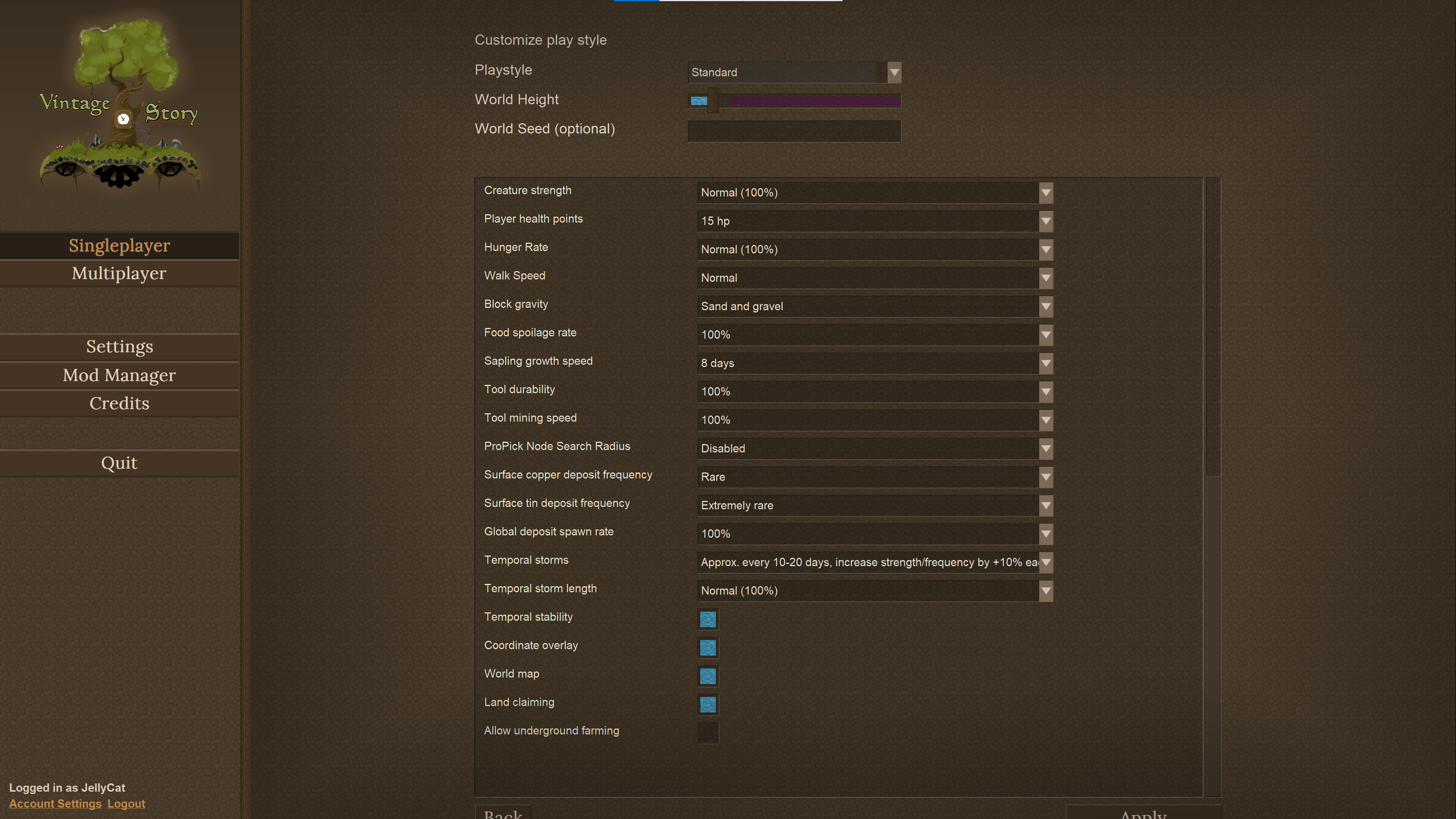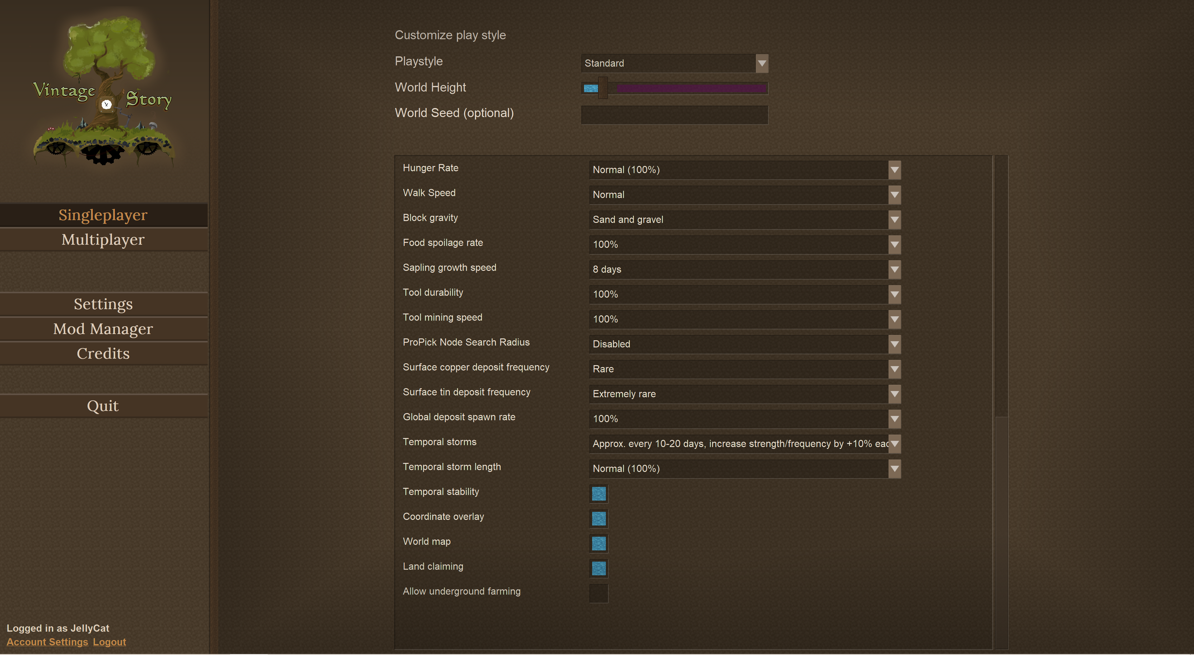 3. As far a I'm aware this isn't possible, at least not from inside the game. The closest thing I can find is here about changing things in the game files themselves: https://www.vintagestory.at/forums/topic/3849-option-to-change-default-world-gen-settings/ but this looks like it was a couple versions ago, so it may be a bit different. Also it obviously requires manipulating the files which is a hassle and a little scary imo, lol. It would definitely be a very useful feature though!