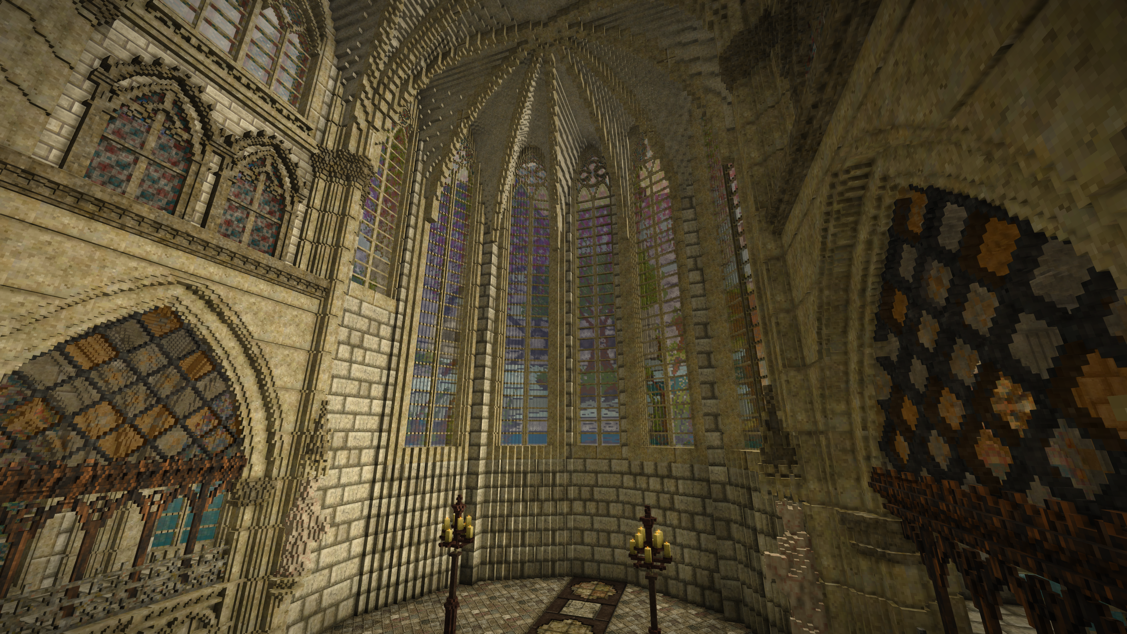 That was a long wait, I guess... Another build update! (a lot of pictures from initial post are changed, so check them out. That's a little teaser) Chiseled tympanum for the inner side, and changed the plain look of the gate walls, added little statues at the top of the gate. Changed altar configuration and added two more stained windows to it. Chiseled remaining stained windows as well. Finished about 90% of work for the altar (pulpit, choir, rood screens, balcony for clergy). Changed floor materials. Some of the interior work done as well. I would probably need to make pews a bit less chonky.