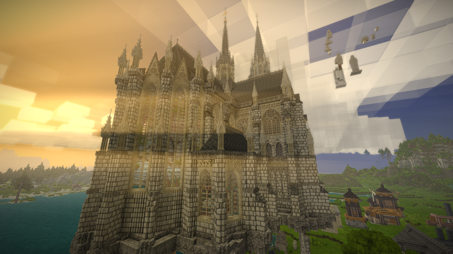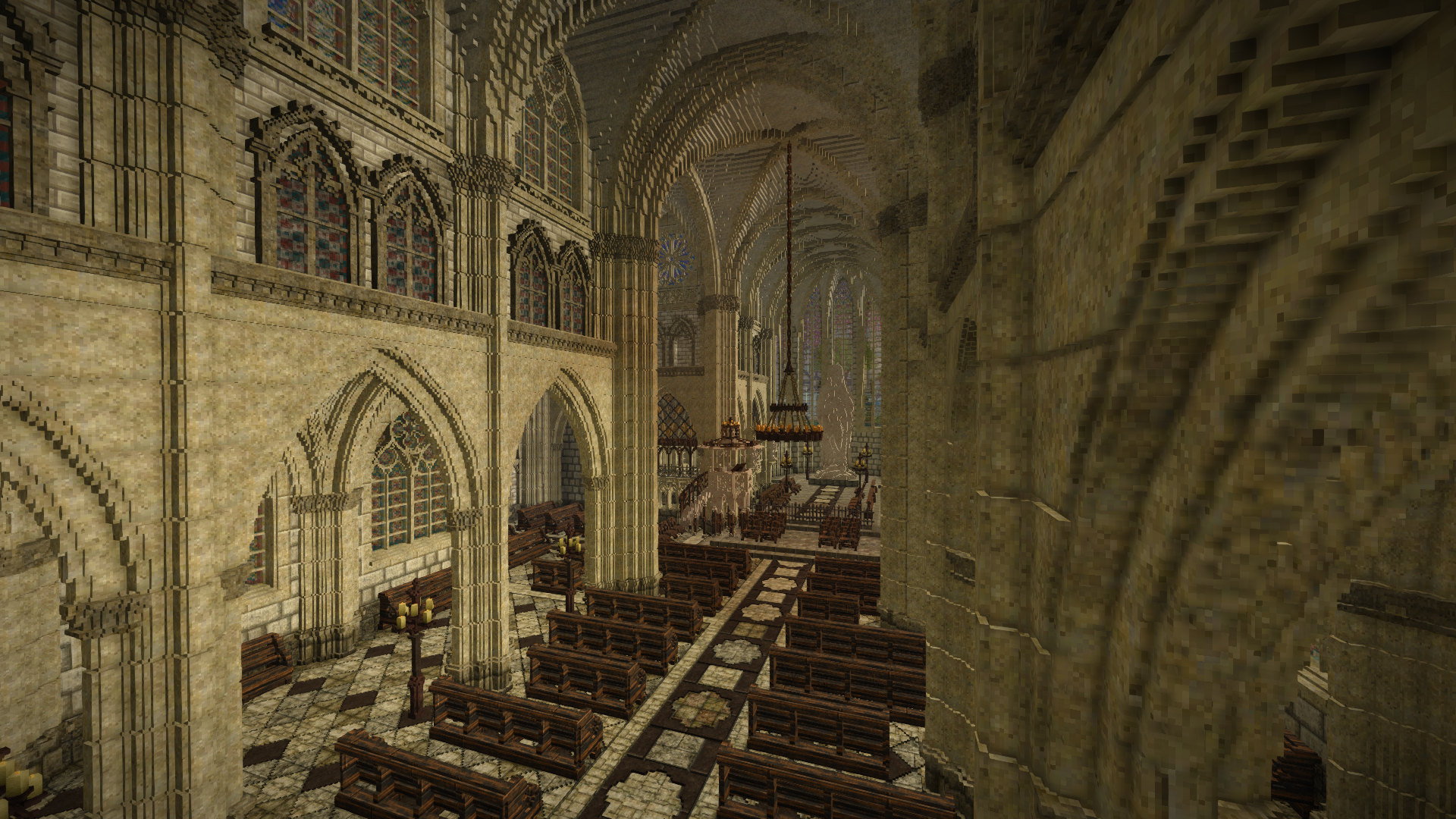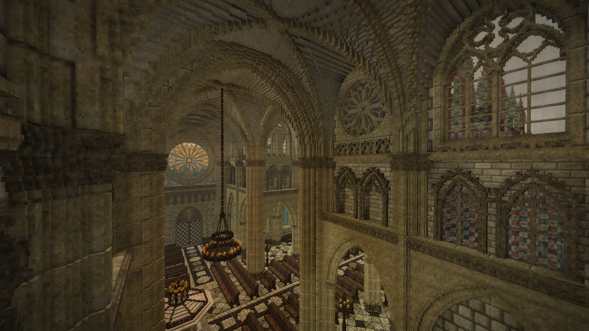Working on it for a few month, reaching about 72 170 hours. Approximately 70% 90% of the building is complete, but only 40% of work is done - I have to chisel five (seven) giant stained windows for the altar, change one of the transept windows for a round one, because I hate how they're stacked at the corner, finish the side facade walls with two windows, make the interior (choir, furniture, stairs, lighting, etc), two spires - one above the transept and the second for the bell tower, the bell tower itself, finish the roof and obviously make some flooring. Also, need to fix remaining shadow issues caused by chiseling according to the guide I have (hint-hint) Will update this post when I get anything new to show. Some of the pictures will get removed or changed in order to show the actual state of the build. upd 03.05: Having reached my attachments limit, had to remove some and re-upload all pictures in order to preserve all actual ones. Inserted three out of five stained altar windows. upd 12.05: Finished altar roof, added 4th stained window for the altar, "painted" tympanum a little to increase readability, chiseled one small rose window for the corner part of the transept and for it's gable, and moved the statue to where it should be. Also did some floor tiling. This build reached 120 hours. upd 19.06: Chiseled tympanum for the inner side, and changed the plain look of the gate walls, added little statues at the top of the gate. Changed altar configuration and added two more stained windows to it. Chiseled remaining stained windows as well. Finished about 90% of work for the altar (pulpit, choir, rood screens, balcony for clergy). Changed floor materials. Some of the interior work done as well. I would probably need to make pews a bit less chonky. World reached 170 hours. upd 02.07: Added maintenance stairway, masked it with a tower on the outside; made decorative fencing on side facades quite a bit higher, and, finally, installed the spire. upd 14.07: Partly finished the bell tower and updated pictures where it could've been.