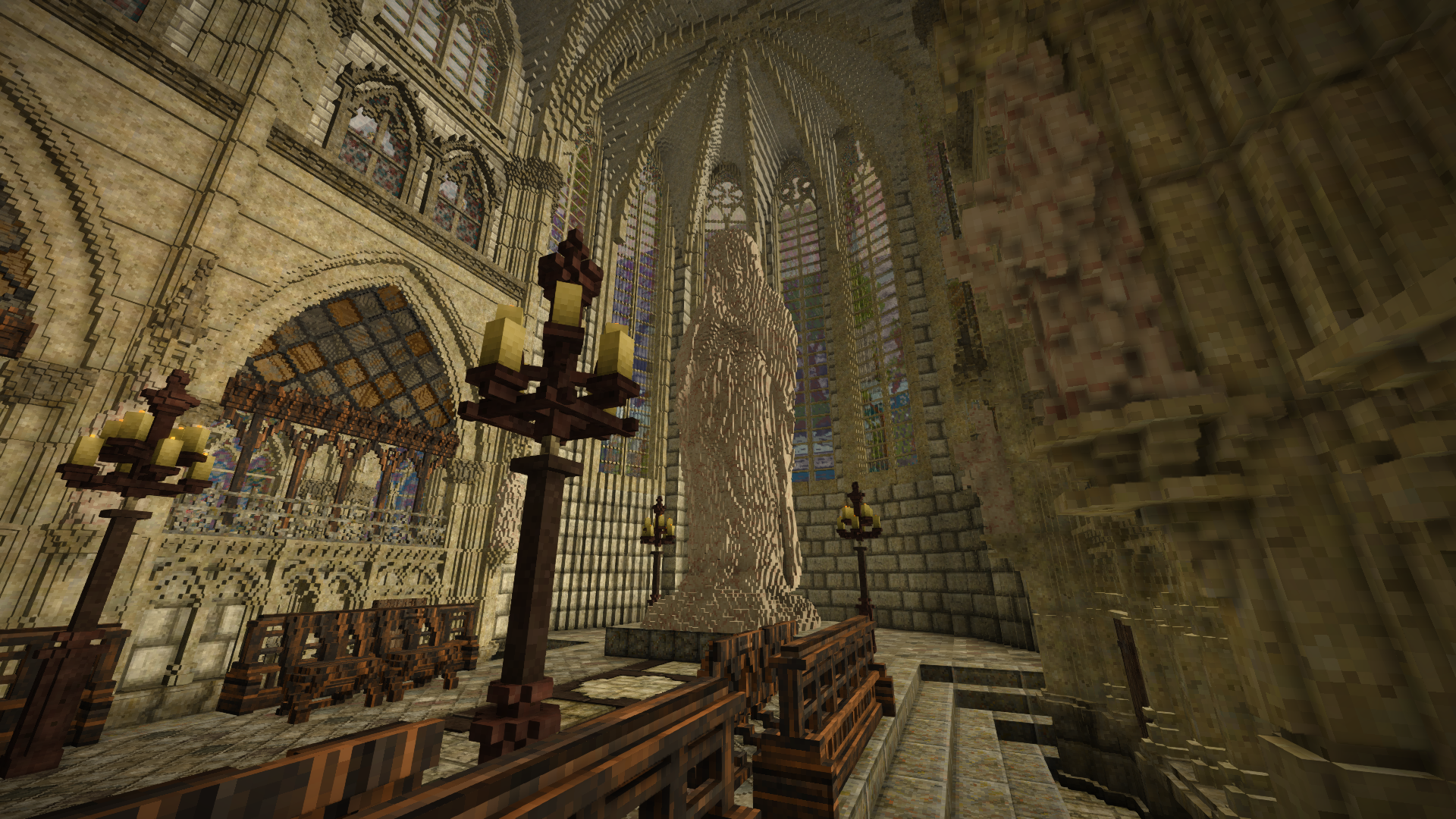 Second stained window... done! At first, I started with the pristine statue - was watching anime "Maria Watches Over Us", and when I had a single glance on the statue there, I decided that I could build that in the VS. Did a few takes, had finished first statue - it was on a different post, but unfortunately I ran out of attachments limit, so you probably won't find it. After that, I did second attempt on sculpting, which didn't turn out well and I scrapped it. A few months later I started chiseling new statue, and, after finishing it, I decided that it looks too good to be left in open, and so now I'm building a cathedral. That's the story of how I started making it. After surfing through a lot of stock photos, came first attempt at cathedral building, which, as it turned out, wasn't good IMO, and, given that I didn't get far enough into the building progress, I managed to acquire experience of how not to build it. A lot of additional references later, I had particular vision of how I want it to look like - it should have side facades similar to Notre-Dame de Paris, it's main facade should look close to the side facades of Cologne Cathedral, have singular bell tower similar to Bavo's Cathedral in Belgium, and two spires - one above the transept and one on the tower. Some time later I found the cathedral that actually summed up all of my desires in one way or another - Nikolaikirche in Hamburg. With one little problem to looking for it's references - it was bombed in the WW2. Then, I learned how to calculate gothic arches using geometry, and applied that method to drawing pixelated arches in aseprite. And so, the building process began. Stained glasses on the altar are sketched out, other - built in place after some calculations. That's pretty much it. upd: Added answer to the question above upd2: Removed unavailable pictures.