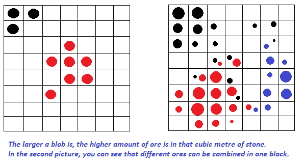 A large yet unseen feature which would make mining adventurous and more immersive would be the reworked ore system. What is the problem with the current one? There is no change that one cubic meter of stone is full of rich minerals and the one besides it has none of it. The chance of multiple ores overlapping into one block also can not be avoided.