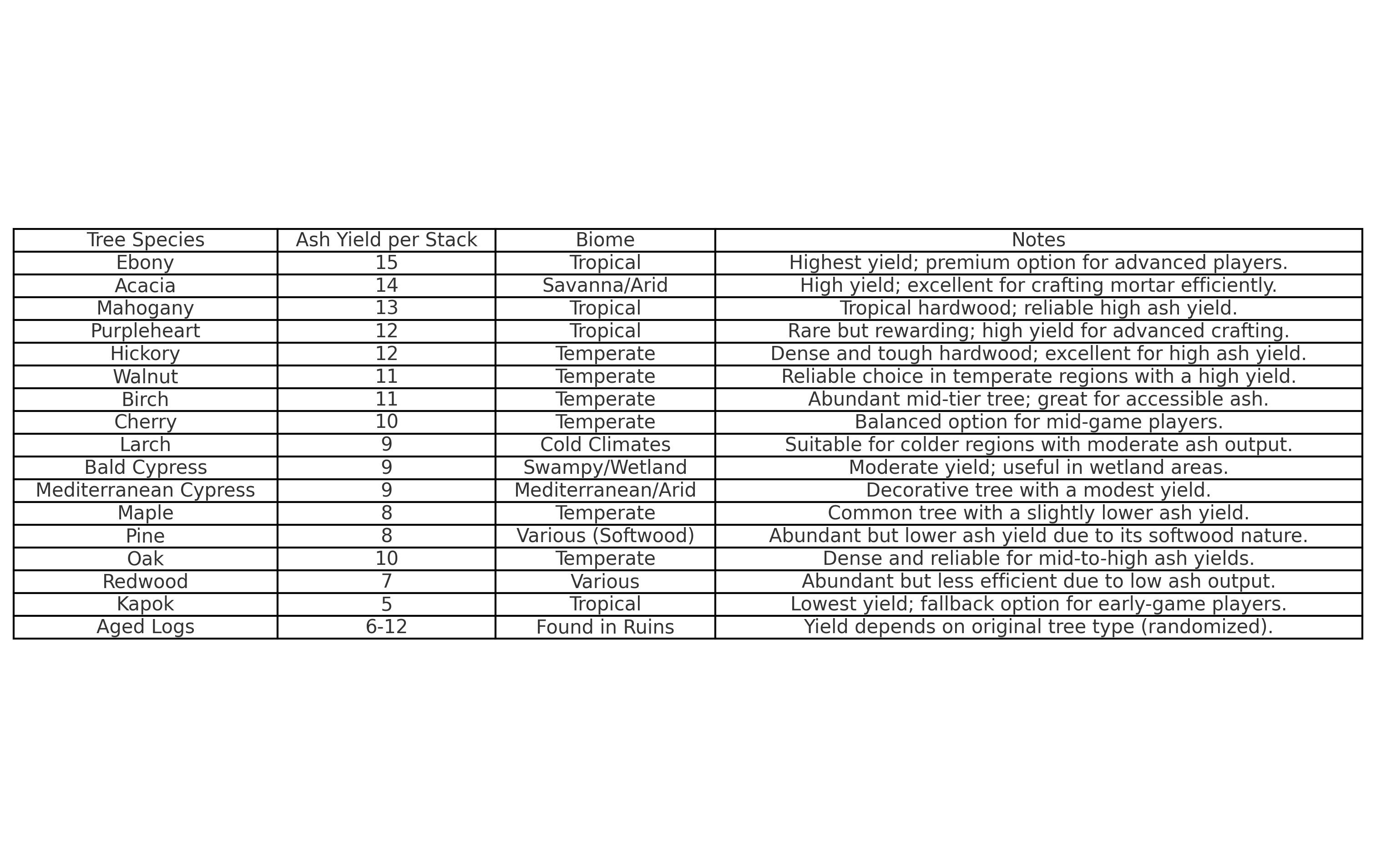 We need the ability to make mortar from ashes created by burning wood as a alternative to finding limestone, chalk, marble, bones, shells, etc. Here should be the basic steps to make mortar from wood ashes in game. Stage 1 - Burn Wood: the game needs to Make burning firewood produce ashes. Burn wood in a fire to produce ashes. I recommend making something similar to the charcoal pit, except have it uncovered so it burns firewood in mass to produce ash piles similar to charcoal piles with the charcoal pit. The game needs to make it so some woods are better to burn than others for ash production by making different firewood types make different amounts of ashes. A Image ChatGPT made me that shows recommended amount of ashes that should be produced from burning each type of wood. 1 Stack = 32 pieces of firewood Mahogany, Cherry, and Hickory trees should be added to the Game. Ashes should be able to be milled in the quern to make fine ash. Fine ash should double the amount of ash clay produced in stage 3. Milling ashes would make windmills very useful. Stage 2: Mix Ashes or Fine Ash with Water: Mixed cooled ashes or Fine Ash with water to create a ash clay like mixture from the ashes. Stage 3: Form Ash clay into balls Some crafting recipe is used to create balls of raw ash clay from the ash clay mixture Stage 4: Heat up the ash clay balls in fire Light a fire and bake the ash clay balls in it. Stage 4: Extract Ash clay balls from fire and mix with Water while hot Use tongs to Extract the ash balls from the fire and mix with water while their still hot. The ash clay balls immediately start reacting with the water when hot. Stage 3: Mix Ash ball water mixture with Sand In a barrel mix sand, along with the ash ball mixture > this will produce mortar. This video shows a basic idea of how mortar can be made from ashes.