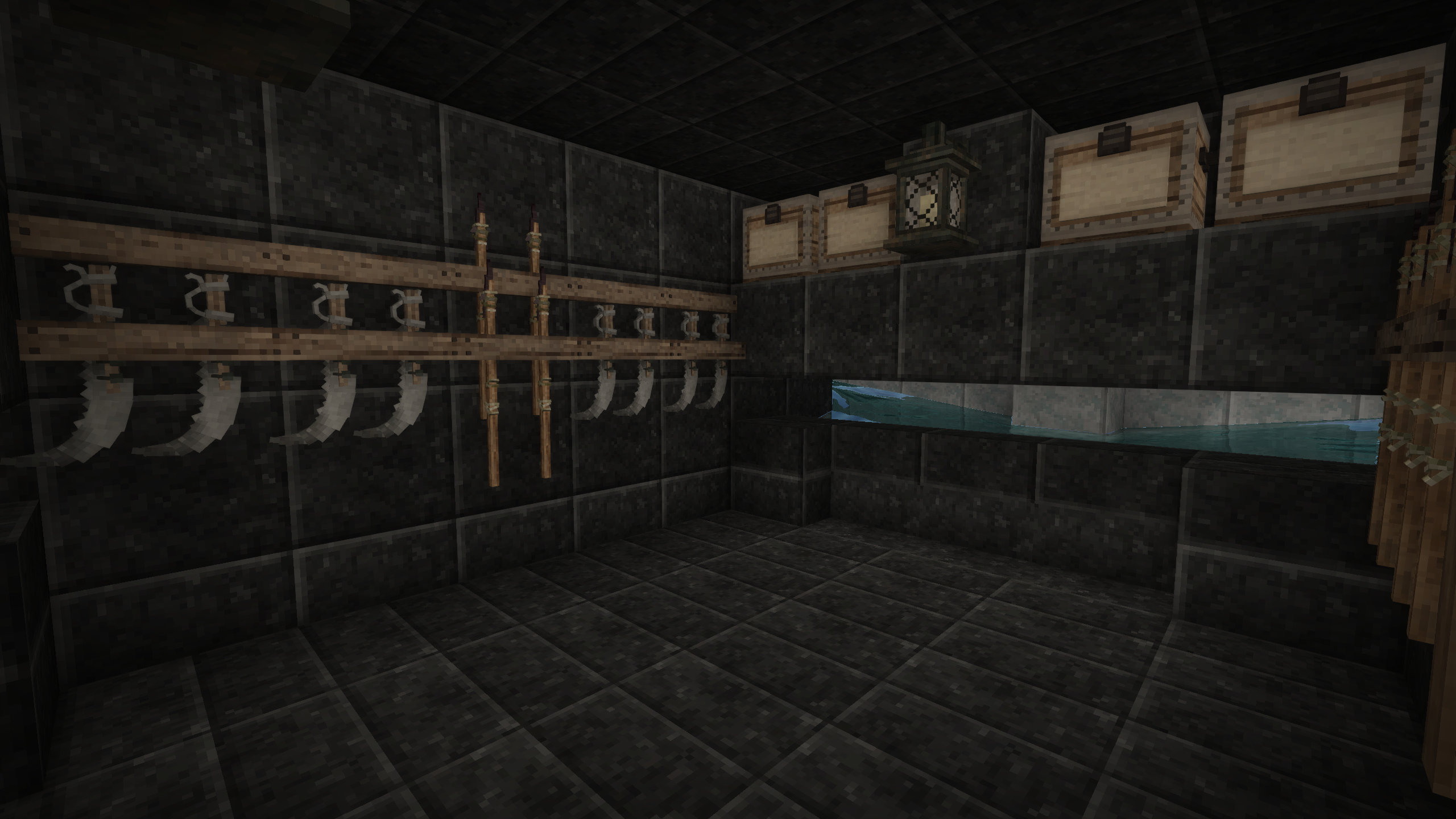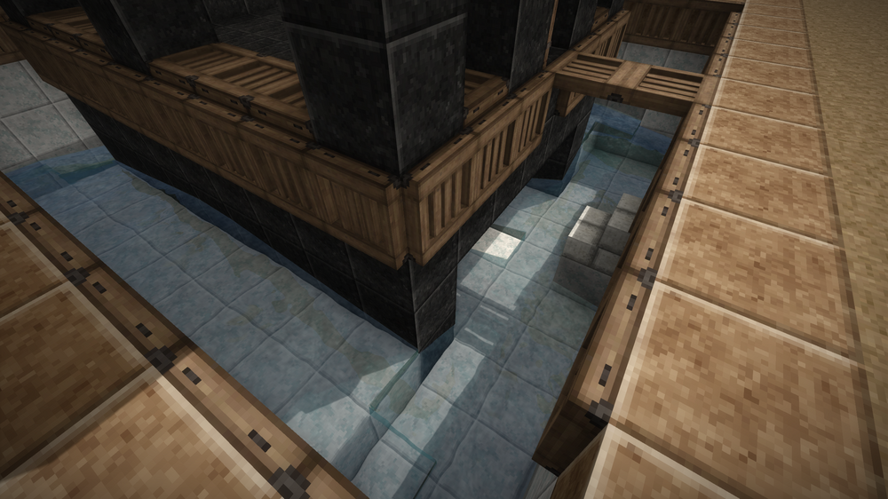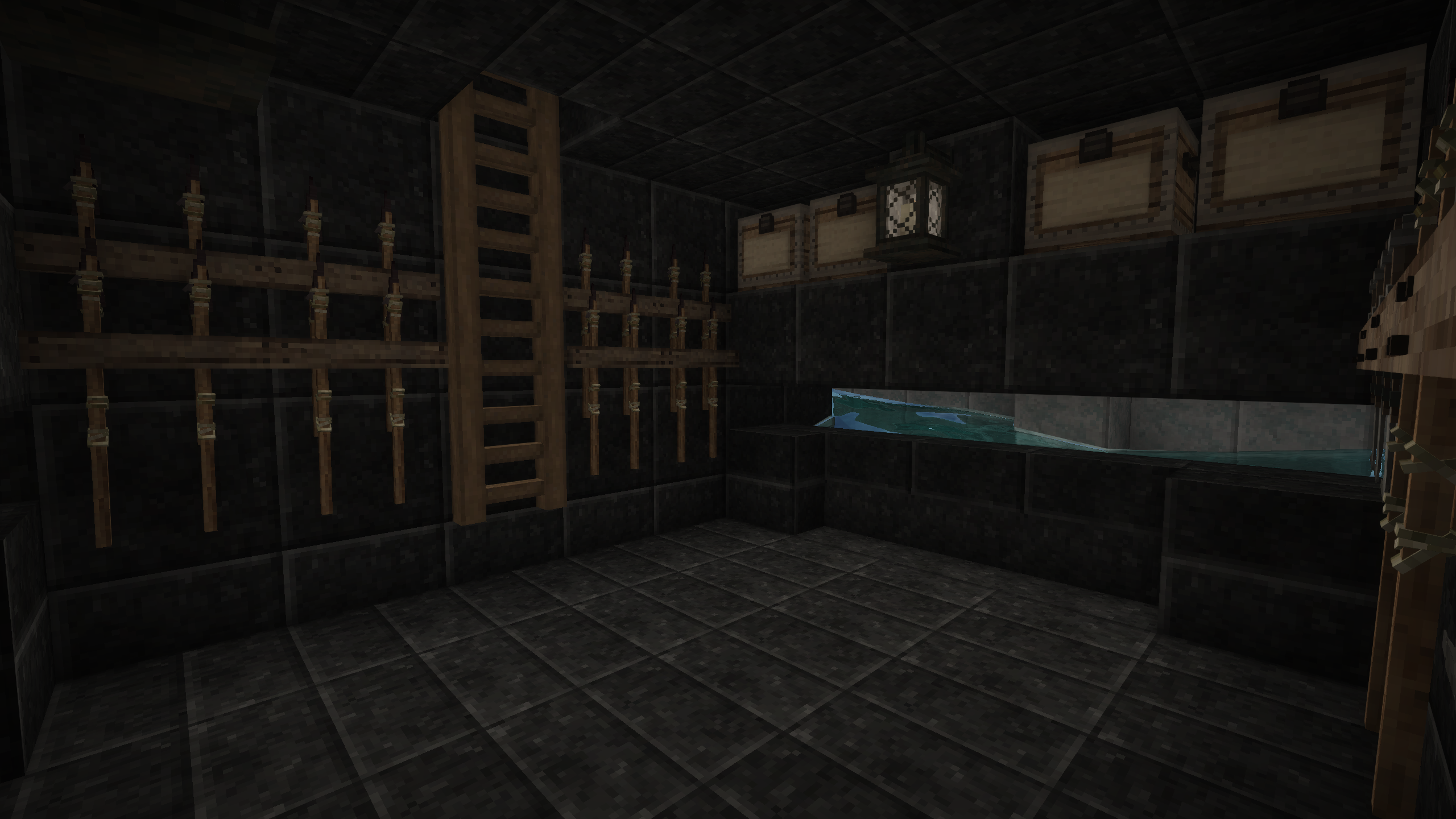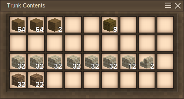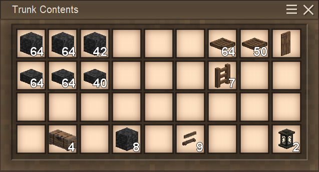 I was hoping I might be able to cheese the upload size limit, but it appears this forum keeps proper track of author upload sizes (nice, but also annoying since I've got more to share). Anyway, building the trap takes a bunch of materials: You can use any full block you like for the build, however the quantities of the two first trunk screenshots are the amounts needed. The same goes for the slabs: they can be any material you like, as long as they are slabs. The slabs serve two purposes: primarily to prevent Drifters from spawning where we don't want them and secondarily to allow access to hitting them with weapons while at the same time preventing Drifters from throwing rocks at us. So, slabs are important! The amount of trap doors and ladders are also important. In the second trunk screenshot, I've dropped in 4 trunks and 8 additional blocks - these are choice options. If you want storage down in the kill chamber, use trunks or chests as you see fit (might be nice to have a few storage slots for things like healing and maybe a bit of extra sticks and stones to knap up a few extra weapons in an emergency. I have also added in tool racks for hanging weapons - again optional. You can use the optional lanterns or regular torches, as long as you attach them on a block space directly underneath the ceiling (slabs). We have found that in 1.18 Drifters are sometimes able to spawn on top of a torch / lantern if it is placed with one block of air above it. The two stairs help push the Drifters down into the pit when they drop in from above. That little indentation in the middle, helps funnel the water streams to the center of the kill area where Drifters would otherwise gather up against the far wall away from the kill area. Using a solid / full block in that space will have the Drifters stand on that block and stay there for longer. The third trunk is stuffed with Packed Dirt. I have added a 4 block wide border around the edge of the water collection pit, which serves the purpose of better visibility during temporal storms. Grass can't grow on Packed Dirt, so that area is guaranteed to be grass free making it easier to see the Drifters around the safe house. My material choice shown in these trunks is solely for the purpose of providing greater visibility by having sharp contrasts between the dark safe house and the bright inner part of the watery pit, which should make it slightly easier to see the Drifters during a storm where everything twists and the sepia takes over. There is no other reason for the choice of materials than that, apart from trying to select materials that are a bit easier to come by in survival and relatively early game. This trap works best when sunken into the ground, so having reached the Copper Age is recommended, unless you can accept doing a lot of dirt digging and landscaping with flint tools. For the kill zone to work the best, again it is recommended having reached the Copper Age at minimum, so you can craft yourself a hammer and a chisel. Use them to chisel out an indentation into the kill area, as I've shown in the last screenshot. You can use the 8x8 size which cuts away a quarter of the block space size at a time. Cut the three middle blocks and slabs in half. Doing this will allow you to crouch and slide into that space so you can reach the dead Drifters to harvest them - some of them will end up right outside the one dry spot in the setup.