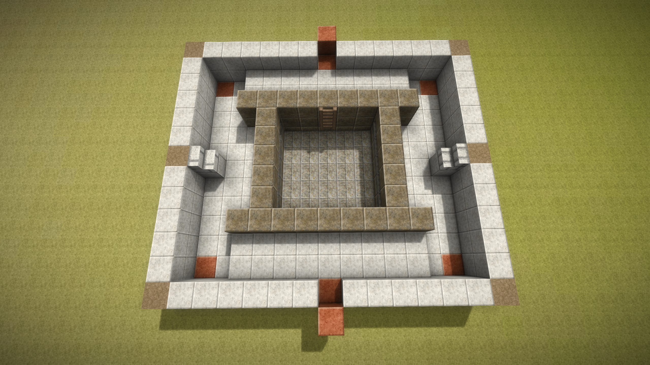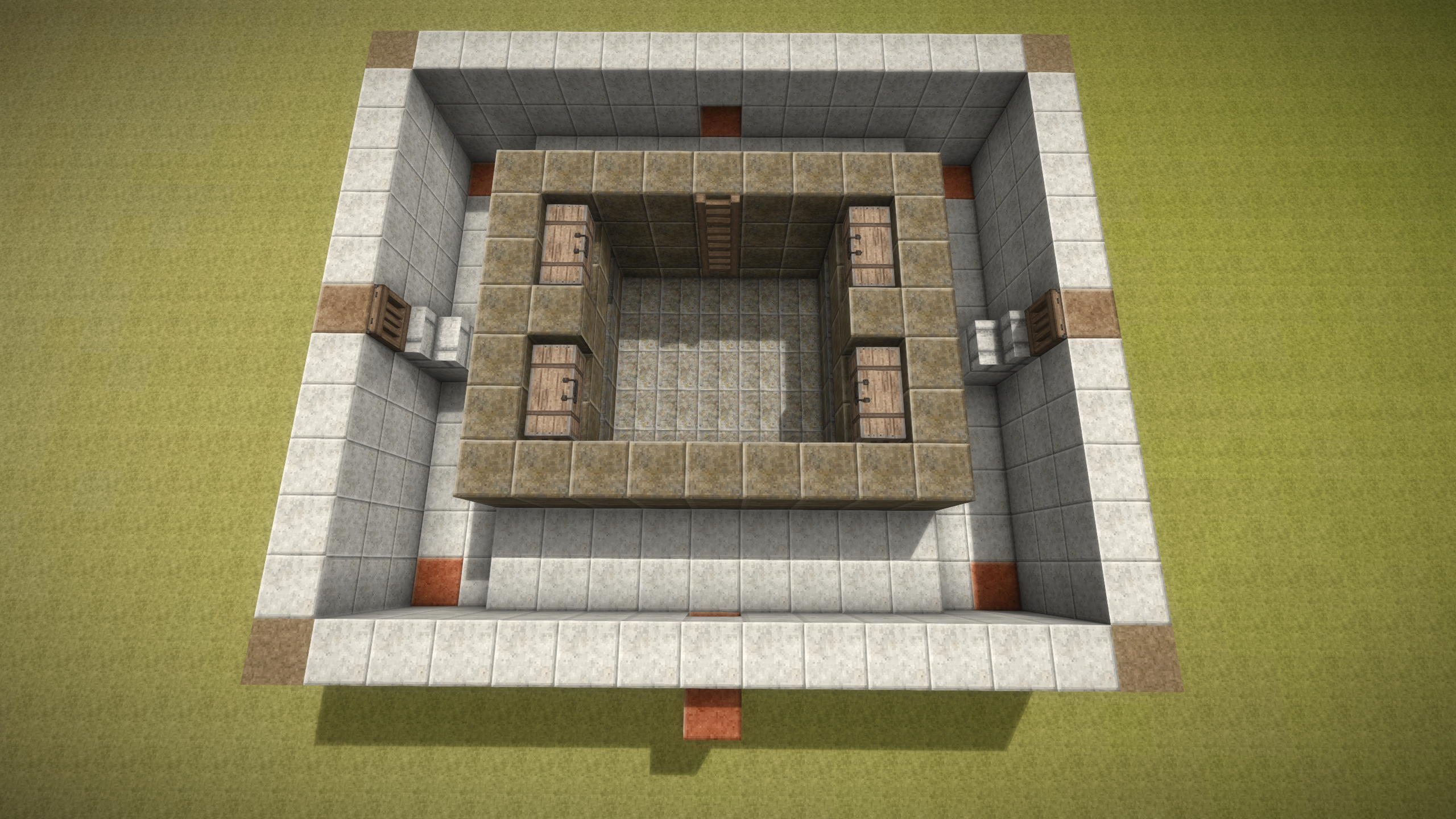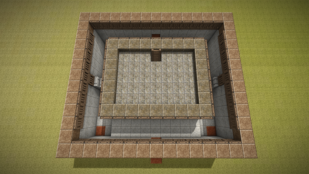 Well, seems I might have been wrong about the upload size, so here is the first batch of the build guide screenshots. To build this trap you will need to dig a 15 x 13 hole that is 5 blocks deep. If you don't care about the looks of the trap, you can dig a 13 x 11 hole that is 4 blocks deep instead and reduce the amount of blocks accordingly, however at the very center of the build there has to be a 5 x 5 block are that is 5 blocks deep! This is where the (slab) floor of the kill chamber will be, so it is important. For the purpose of the build guide screenshots I have chosen a bunch of polished blocks, solely to make it easier to count out the design while building it. As mentioned in the initial post you can pick whichever materials you like - it makes no difference to the functionality of the trap. The bright orange blocks indicate where to place the water sources. They do not have to be a different material - this is solely to make it clear where the water sources have to be placed. Once you have completed the second layer, you can place the water sources in the 4 corners of the build. The 4 water sources at the bottom should be placed before the 2 upper water sources, to ensure that the water streams behave. Note the ladder placement - you can pick either side, whichever fits with your preferences. By the third layer, you can chip into the pit walls and install the last two water sources, which then completes the water stream setup. On the 4th layer, I have installed 4 trunks for storage in the kill chambre. You can of course use chests if you prefer or if you don't want storage in the trap, replace the trunks / chests with solid blocks (that's the optional 8 extra blocks in the material listing). Note the additional two trap doors that are installed just above the stairs! These are important to coerce the Drifters into walking off the stair block quicker. The 5th layer is where you should reach the surface and where you should start placing trap doors all around the inside the pit.