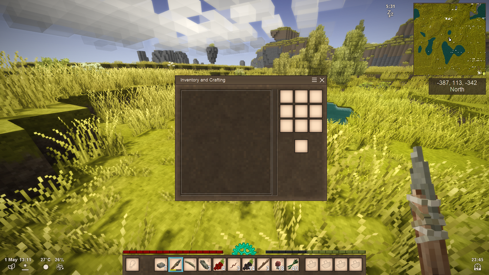 Pinky glances around to observe the beautiful and sunny day. He feels the warm wind gusting, and can see the nearby trees and bamboo swaying as a result. The air is thick and a layer of sweat is building up all over his body, making his clothing stick to him. The nearby pond looks very inviting and makes him want to dive in in an attempt to cool down. Instead he closes his eyes, so that he can take in even more info. He hears the insects and birds mixing into a glorious cacophony. He smells the sweet bamboo and salivates at the thought of roasting it with some pork that he has stored back home in his cellar. He opens his eyes, reaches into his backpack, and pulls out his hand scythe. He ruminates on what all he can build with the bamboo while he chops it down. Before he leaves, he pulls out his map and marks the location so that he can come back later for the rest of the bamboo.