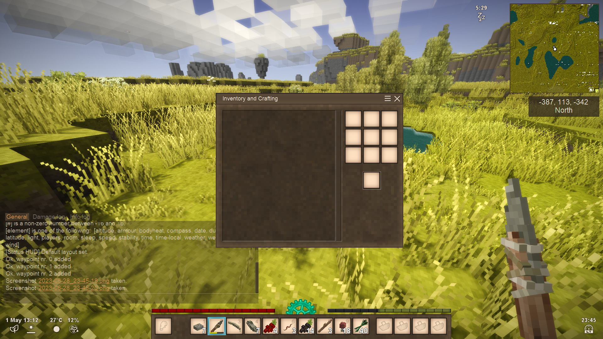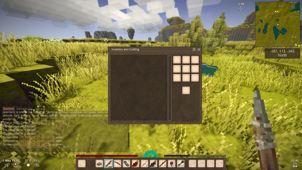Pinky glances around to observe the beautiful and sunny day. He feels the warm wind gusting, and can see the nearby trees and bamboo swaying as a result. The air is thick and a layer of sweat is building up all over his body, making his clothing stick to him. The nearby pond looks very inviting and makes him want to dive in in an attempt to cool down. Instead he closes his eyes, so that he can take in even more info. He hears the insects and birds mixing into a glorious cacophony. He smells the sweet bamboo and salivates at the thought of roasting it with some pork that he has stored back home in his cellar. He opens his eyes, reaches into his backpack, and pulls out his hand scythe. He ruminates on what all he can build with the bamboo while he chops it down. Before he leaves, he pulls out his map and marks the location so that he can come back later for the rest of the bamboo.
