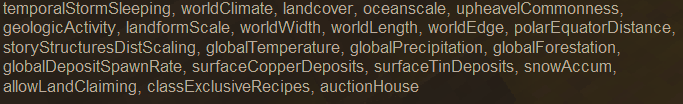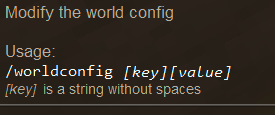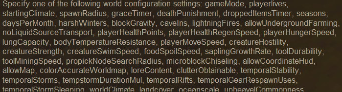 @doomstrike53 I bet if you use the names of the worldconfig commands I listed and added them to the serverconfig file in the same format they would probably work. Try it out and see. You just need to play with it in a test world to find out what the proper [value] to use is. "WorldConfiguration": { "gameMode": "survival", "playerlives": "-1", "startingClimate": "temperate", "spawnRadius": "50", "graceTimer": "0",