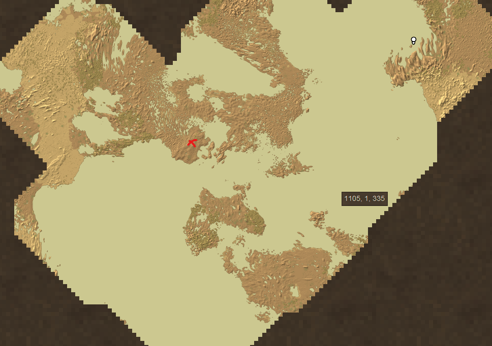So I started to travel and my water coverage is awful. Using the same seed I created this map with no mods, but still using 0% upheaval. That might be my new favorite change to default settings. My next playthrough I think I'll try these settings and hopefully it will have oceans and enough land to have ponds. This one looks like it has both and the red X is the spawn point. "landcover": "0.7", "oceanscale": "1.25", (Anything more than this and I just had nothing but islands) "upheavelCommonness": "0", "landformScale": "1.2",