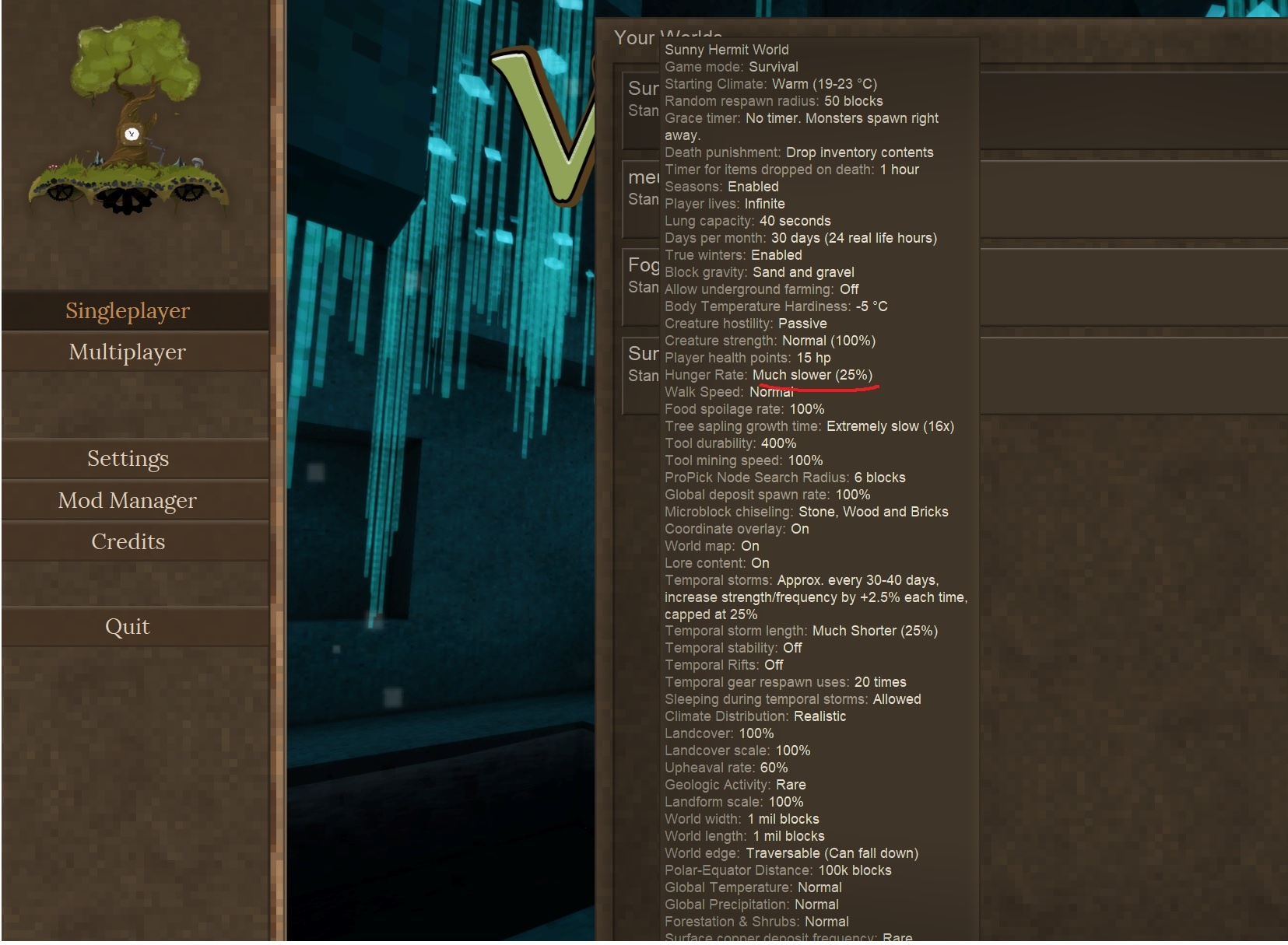 after using /worlconfig playerhungerspeed command and reloading game world in single player no longer works, used to before today, reinstalled game no mods... deal breaker for me, help... tried editing in savefile, end up corrupted...When edited using the command it will show the correct new value in your gameinfo on the main menu, but it still shows 25% : (