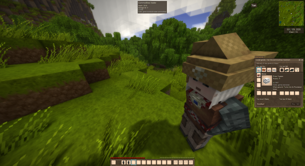 Just threw this together after a discussion with Solstin on his Discord. Since borax is so critical for progression (required for iron anvils and cementation coffin lids), it make sense to me that it would be available from a trader. Clothing traders will only ever have a couple in stock, for a couple gears each. The deal from the commodities trader is cheaper per piece but has a higher purchase price.