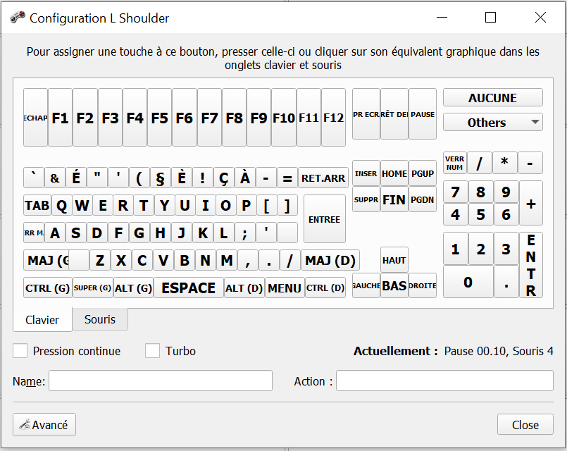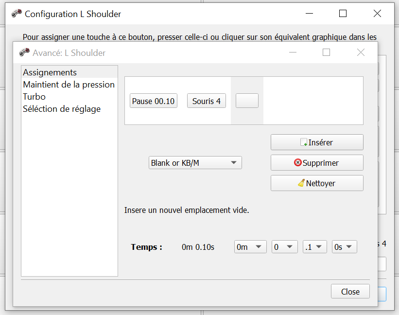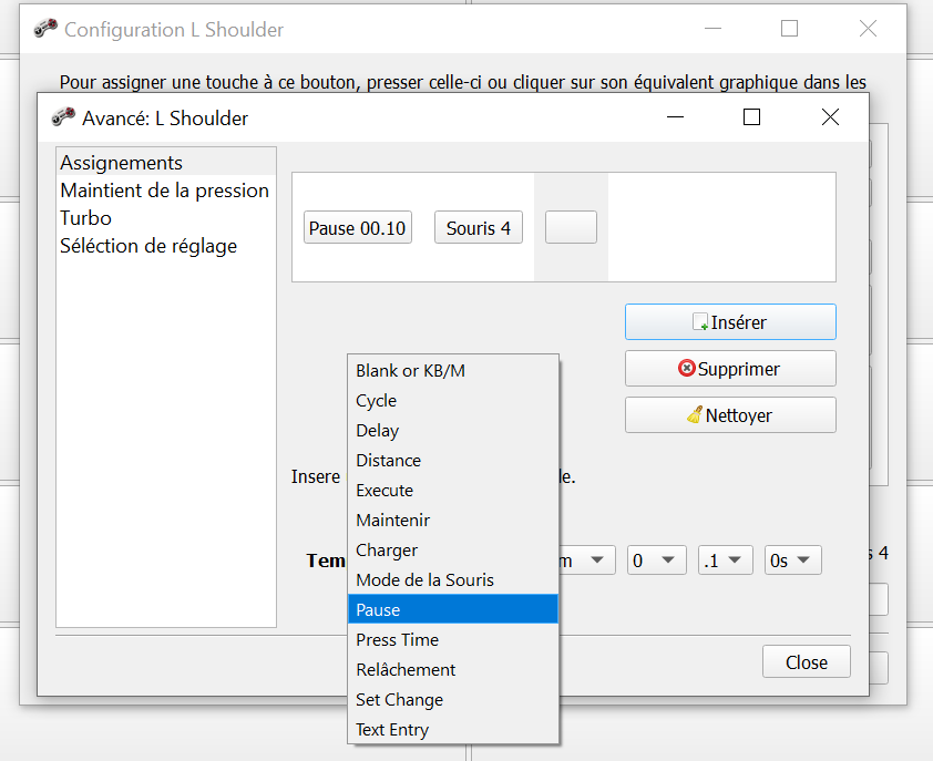 Select "Pause" then select 0,01s (or more regarding your own controller/preference) and finally Insert/Insérer. Now you may delete "Souris 4" and add it afterward so "Pause" comes first" then the linked button. It's really important.