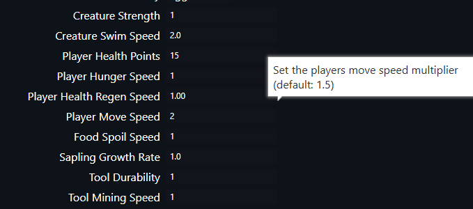 - Server Config won't let me set the player speed value to default even though it says: (default: 1.5) , decimals don't seem to work and keep putting the value to 2 making us able to run faster than rabbits lol