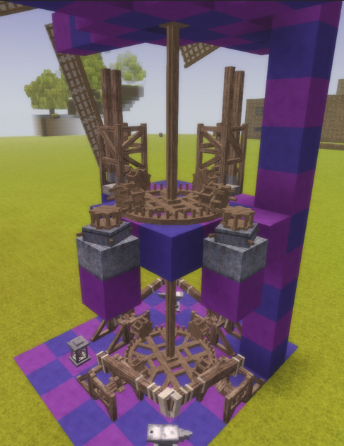 I almost forgor here I am past bedtime to get you these photos Here is a mockup of the contraption I talked about above. 5 large gears, 12 rotors, 4 helve hammers, two querns, and two pulverizers. Each rotor floor is 10 blocks tall, and the rotors are placed 4 blocks from the central axle. Place them any closer and they will hit theirselves and break. (P.S. that other small windmill in the background is from here) With the exception of the querns, which have two small gears to angle the power 90 degrees, everything is connected straight to the large gears. I wouldn't say this is the BEST way; I've seen other mess with the lower 1/2 of the powertrain to reach stupidly fast speeds, but this is how I've done my designs. I wouldn't say that Every one has different talents, and I just like mechanical (and electrical) stuff Do it I would like to see -